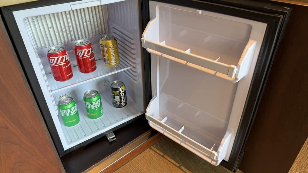 Darunter ist die Minibar untergebracht, die ebenfalls kostenfrei ist, was ich persönlich immer sehr angenehm finde. Das aus insgesamt sechs Softdrinks bestehende Angebot ist gleichwohl nicht weltbewegend.