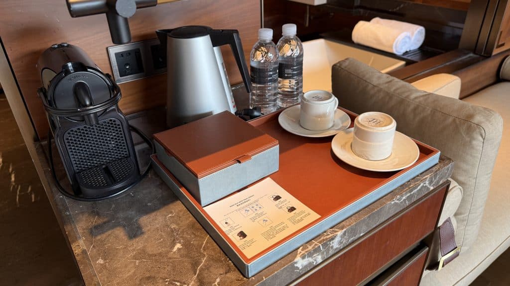 Daneben steht die Kaffeemaschine von Nespresso auf einer kleinen Anrichte – diese ist mit den dazugehörigen Kapseln kostenfrei nutzbar.