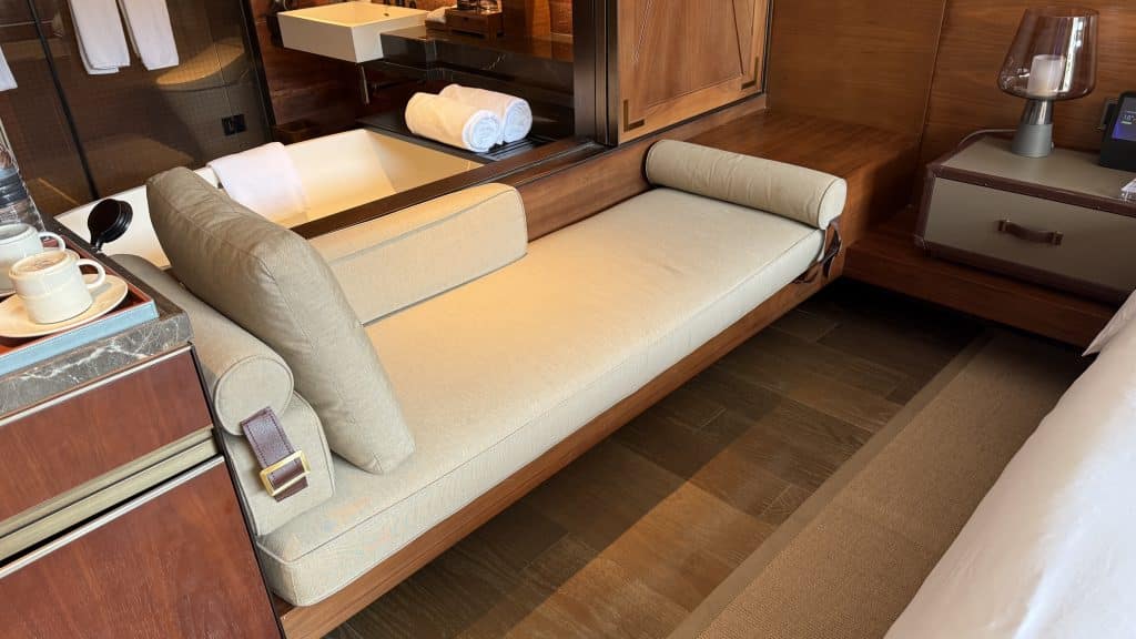 Seitlich befindet sich eine bequeme Sitzbank, die direkt neben einer Holzwand befindet, die sich hin zum Bad öffnen lässt.