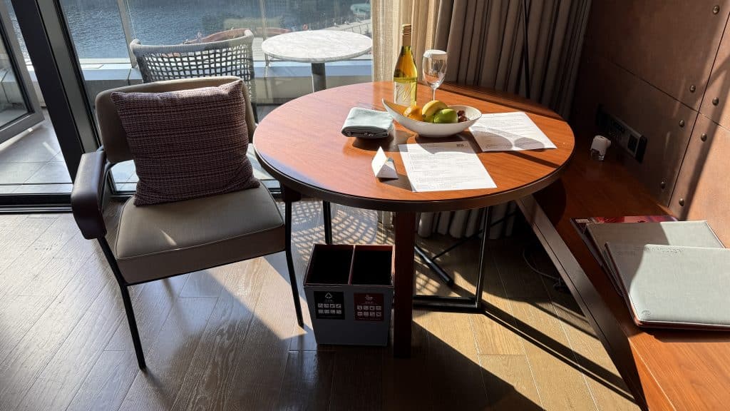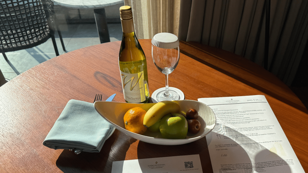Dank meines IHG Diamond Status durfte ich mich jedoch auch so über einige Vorteile freuen, darunter etwa das kostenfreie Frühstück für zwei Personen, einen späten Check-out und ein Update. Letzteres wurde dabei in minimaler Form gewährt, denn statt eines Standardzimmers gab es ein Update auf ein Zimmer mit Ruby Balcony (durch die Farben wird klassifiziert, wo die Zimmer liegen und welchen Ausblick sie bieten bzw. in welchem Stockwerk sie sind). Die Zimmer mit Turquoise Balcony sind dabei darunter angesiedelt, die mit Platin Balkon darüber. Ein kleines Willkommensgeschenk bestehend aus einer Weinflasche und einem Obstkorb sollte später bereits im Zimmer bereitstehen.