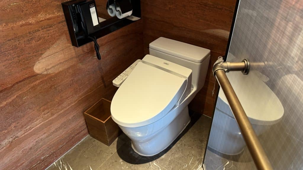 Hinter einer dunklen Tür findet man ansonsten auf der einen Seite die Toilette, die wie in chinesischen Luxushotels üblich zahlreiche Funktionen bietet.