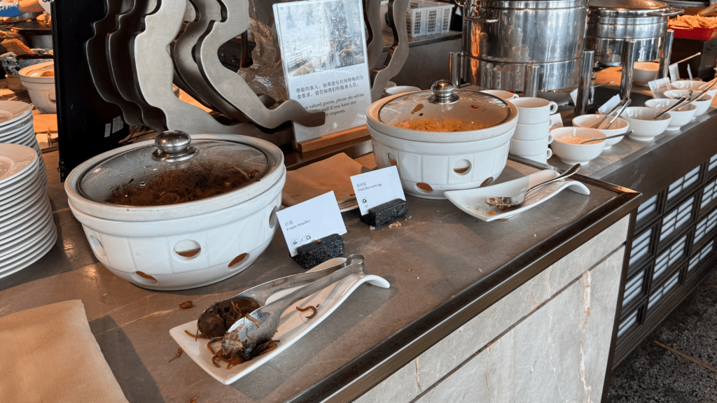 Dass meine InterContinental Shanghai Wonderland Bewertung insgesamt recht kritisch ausfällt, hat auch mit dem Frühstück zu tun. Dieses ist durch den Fokus auf Tourgruppen enorm hektisch und hat wenig mit einem Luxushotel zu tun. Zwar gibt es zum Glück einen Bereich für Statusgäste, in dem man etwas ruhiger sitzen kann, allerdings merkt man am Buffet nicht nur die Menschenmassen, sondern auch den fehlenden Fokus auf Qualität.