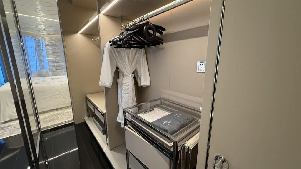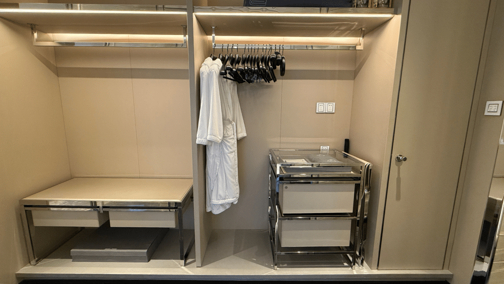 Der Ankleidebereich ist ansonsten zwar recht schmal, allerdings mit seinen offenen und wenigen geschlossenen Schränken zumindest mit regulärem Reisegepäck geräumig genug. Zwei bis drei Koffer kann man hier problemlos öffnen und findet zudem genug Hänge- und auch ein wenig Liegefläche vor.