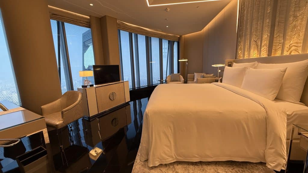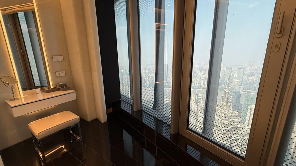 Jedes der Zimmer bietet einen unfassbaren Blick über die Stadt, da alle Stockwerke (86 bis 98) mindestens 400 Meter hoch sind. Bedenken sollte man jedoch zwei Dinge: Erst ab dem Premium Stateroom sieht man in der Regel den Bund, weil die beiden Kategorien darunter auf der anderen Seite des Gebäudes sind. Daneben befinden sich die Zimmer immer hinter einer Art Doppelverglasung mit größerem Abstand dazwischen durch den besonderen Bau des Gebäudes, sodass die Zimmer relativ dunkel sind und man den Ausblick schlecht fotografieren kann.