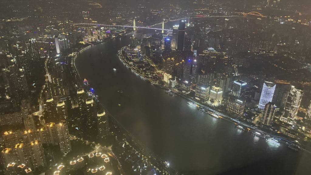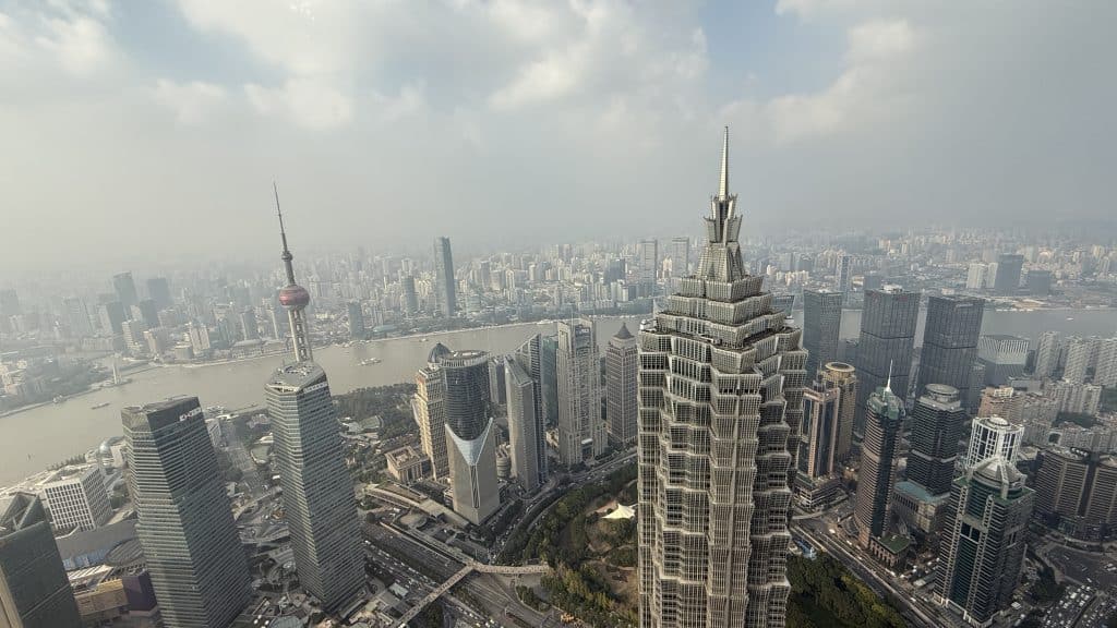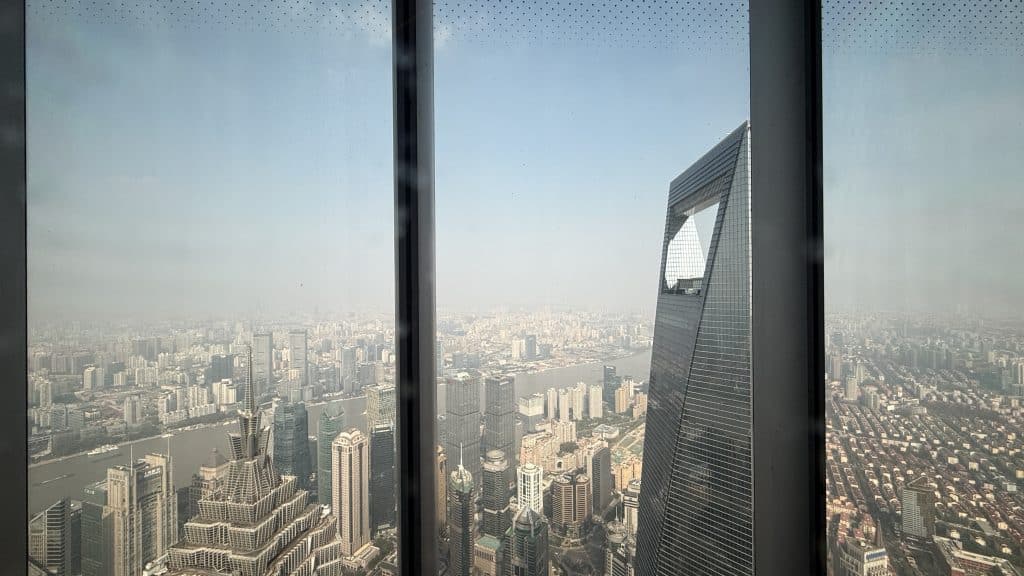 In unserem Fall ging der Blick zum einen auf den ebenfalls sehr hohen „Flaschenöffner“ (zum Vergleich lohnt ein Blick auf mein Park Hyatt Shanghai Review, in dem ich den Ausblick aus dem zweitgrößten Gebäude der Stadt erleben kann) nebenan sowie den Shanghai River und seitlich den Bund, was fraglos ziemlich beeindruckend ist.