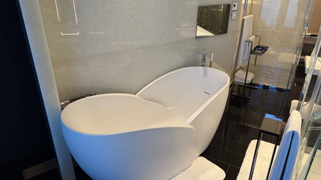 Das gilt auch für den Schlaf- und Wohnbereich, der von der Aufteilung ein wenig an eine Junior Suite erinnert. Durch die geschwungene Form des Turms ist der Schnitt der Zimmer im Vergleich zu anderen Hotels allerdings generell ziemlich speziell.