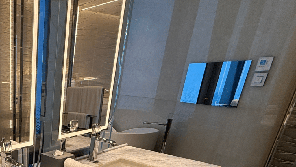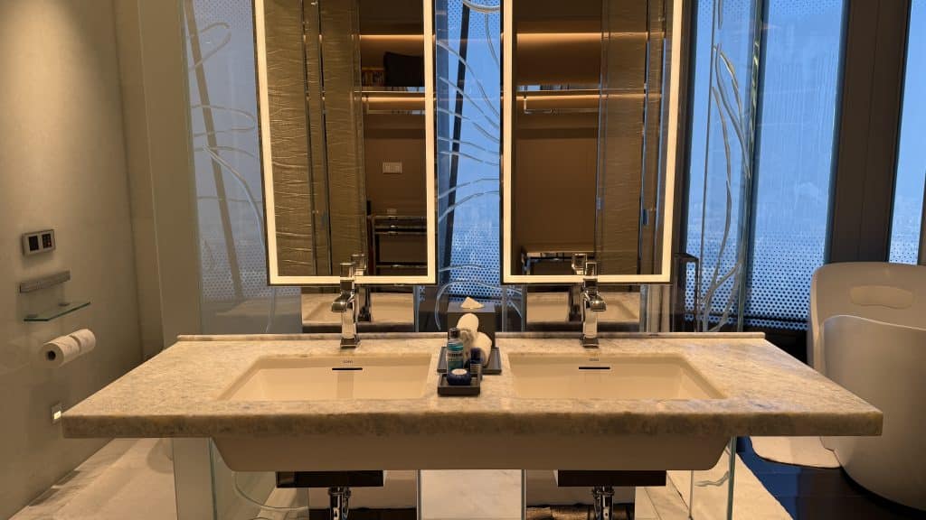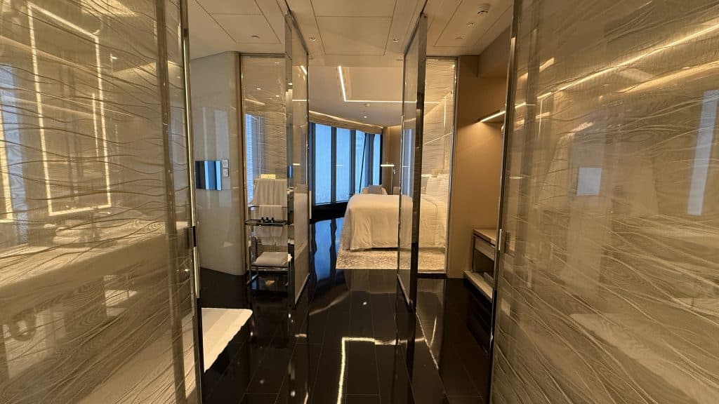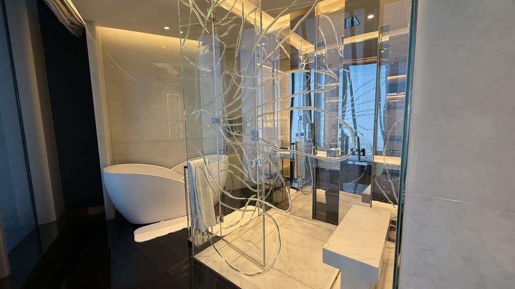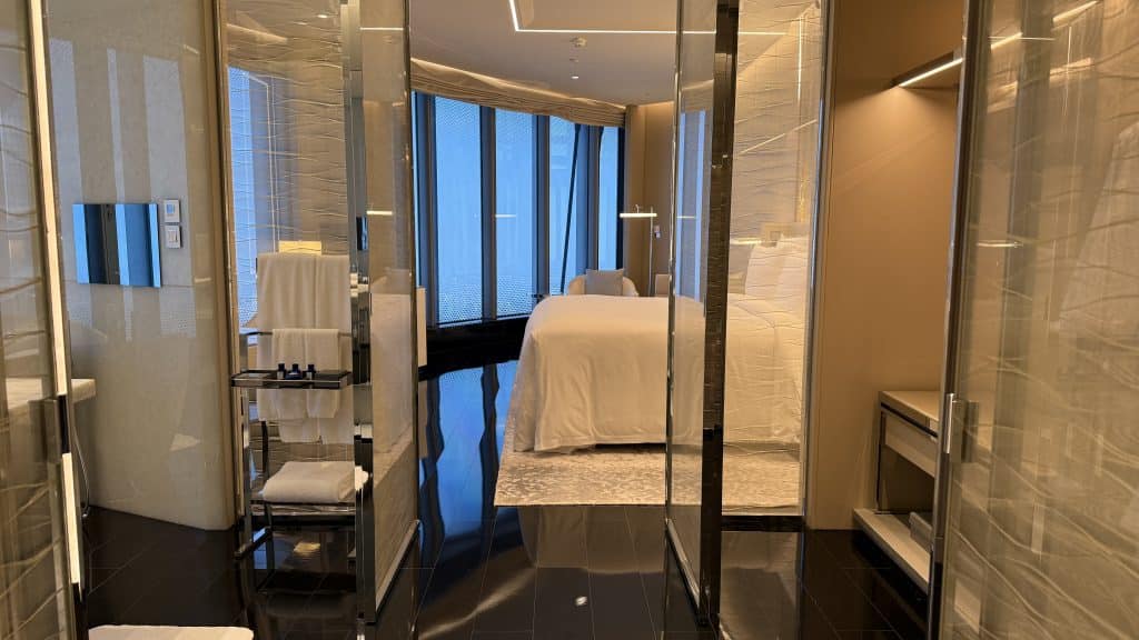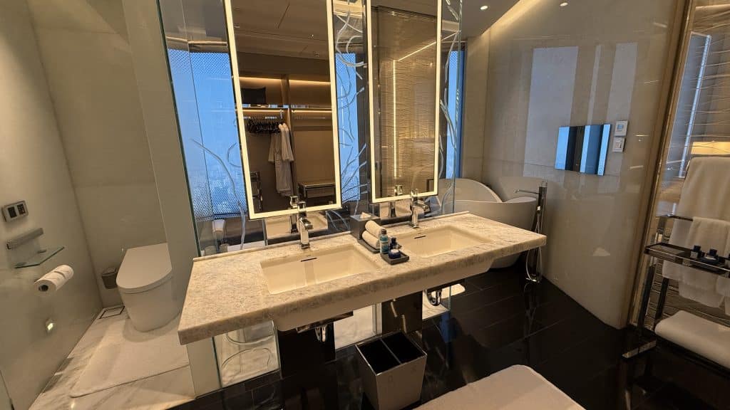 Der Aufteilung des Zimmers wegen will ich in meinem J Hotel Shanghai Tower Test zuerst einen Blick auf das Badezimmer werfen, das direkt gegenüber des Ankleidebereichs liegt und das durch das viele verwendete Glas ebenfalls sehr offen ist.