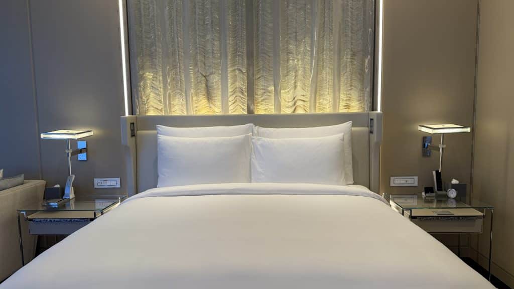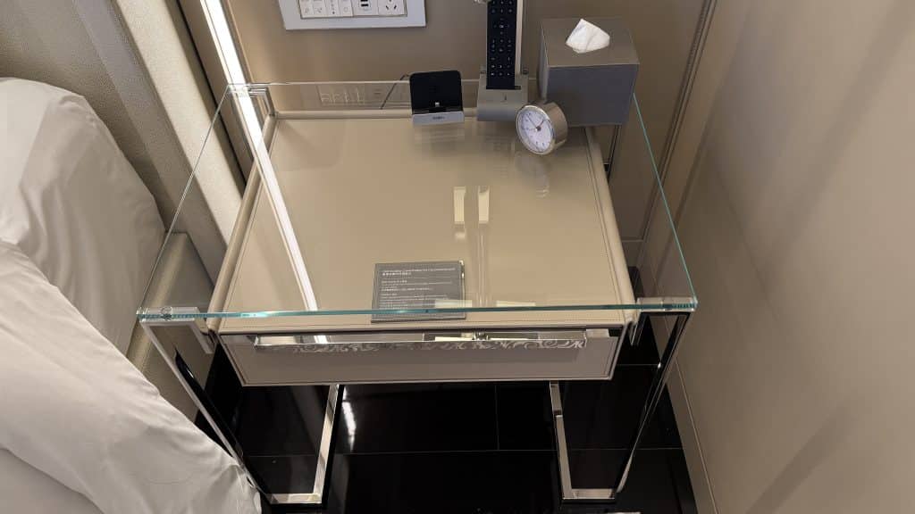 Auf beiden Seiten des Bettes gibt es einen mittelgroßen Nachttisch, der genügend Platz bietet und von dem auch die Lichter kontrolliert werden. Internationale Steckdosen gibt es zudem genauso wie eine Taschentuchbox und einen Wecker. Abends wird außerdem ein Turndown-Service durchgeführt, im Rahmen dessen eine Flasche Wasser am Bett bereitgestellt wird.
