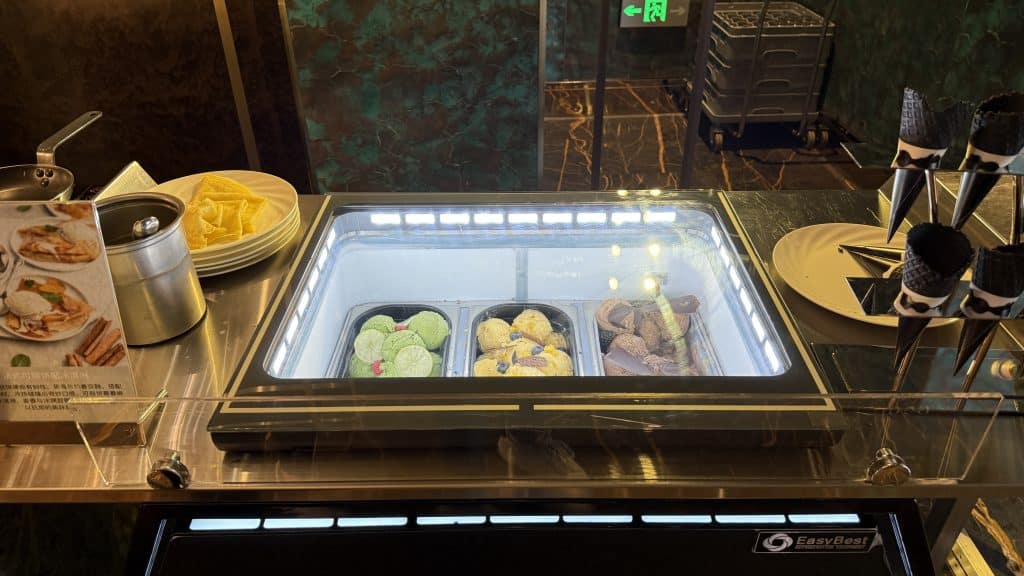Süße Optionen in Form von verschiedenen Kuchen, aber auch anderen Speisen, gibt es natürlich auch. Sogar ein kleines Eis-Buffet gibt es.