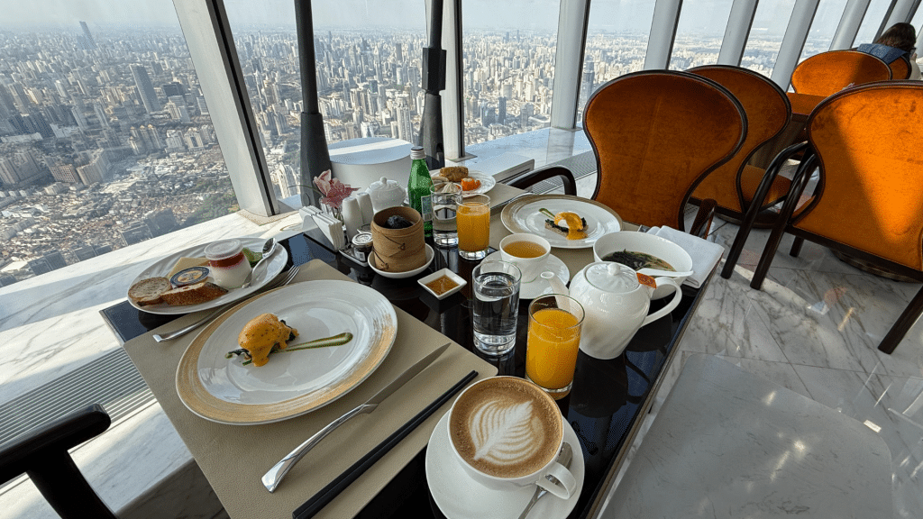 Beginnen möchte ich in meiner J Hotel Shanghai Tower Bewertung mit einem Blick auf das Frühstück. Hier sitzt man auf derselben Ebene wie der Lobby mit einem außergewöhnlichen Ausblick über die Stadt und den Bund. Alleine das ist schon beeindruckend.