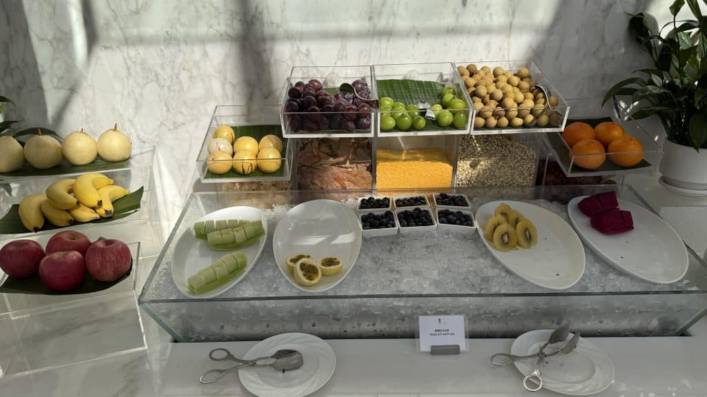 Wie bei einem asiatischen Frühstücksbuffet üblich, gibt es ferner auch ein Salatbuffet sowie daneben eine kreative und hochwertige Auswahl an aufgeschnittenem Obst und Stückobst.