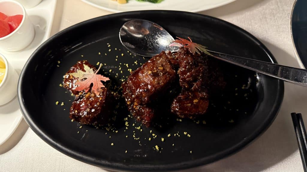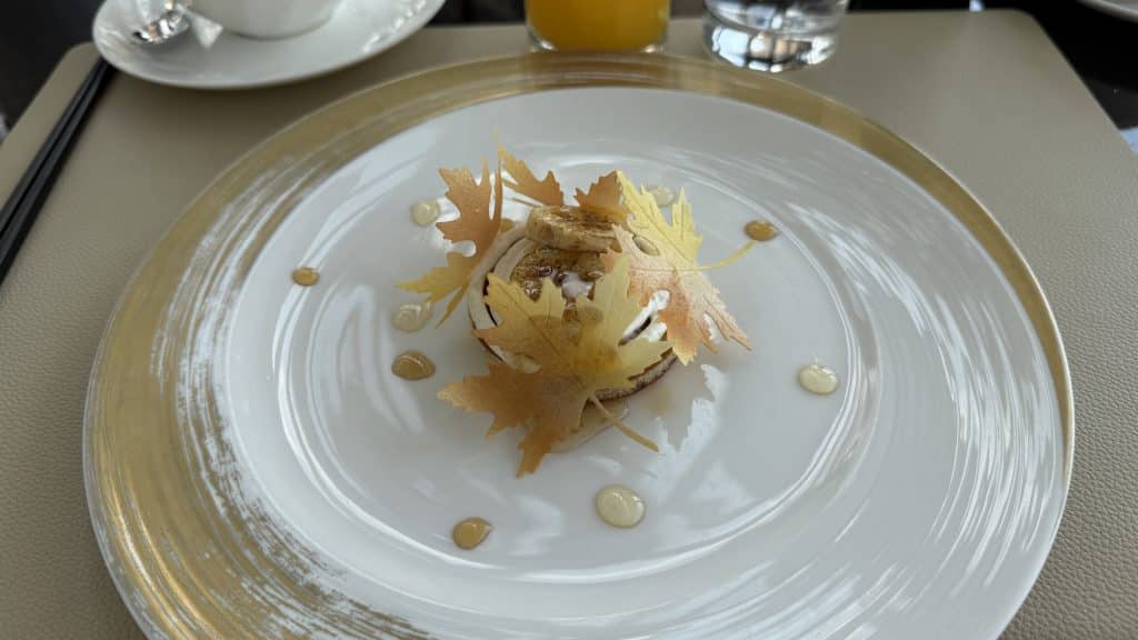 Genossen habe ich auch die Nudelsuppe sowie einen speziellen schwarzen Dumpling mit Trüffel. Kreativ ist außerdem auch die Präsentation der Pfannkuchen mit Ahornblättern – das sieht man so auch nicht jeden Tag.