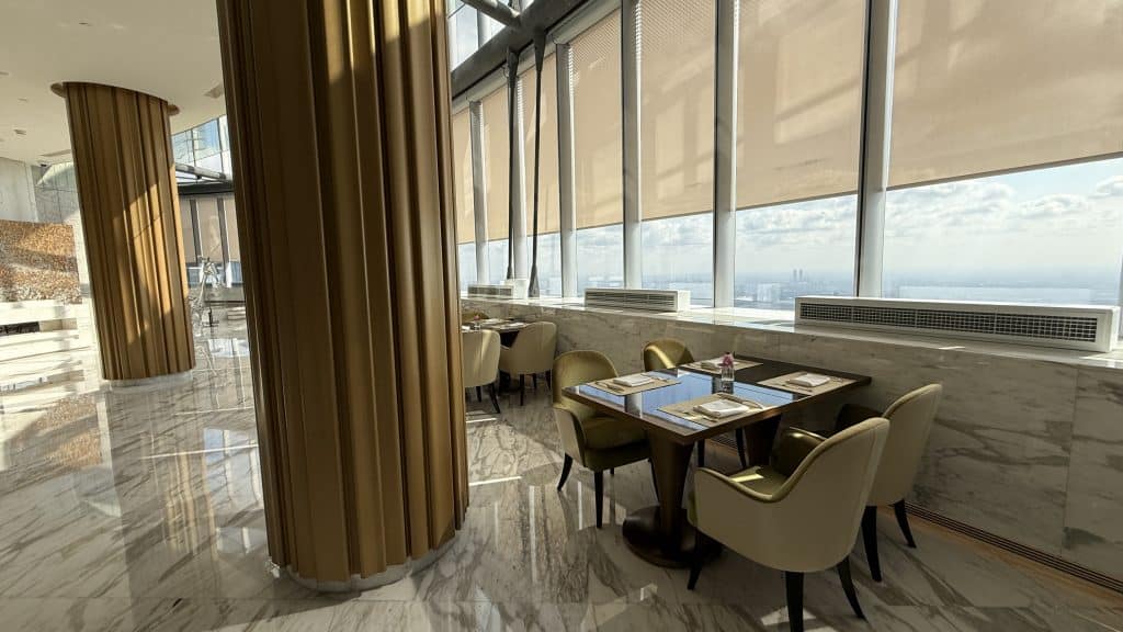 Bei unserem Aufenthalt haben wir diverse verschiedene Optionen getestet. Beginnend mit der Lobby Lounge über den Afternoon Tea in der Yi Lounge bis hin zum Abendessen im höchsten Restaurant der Welt und dem Frühstück im Centuono Restaurant. Nicht genutzt, aber angeboten wird natürlich auch ein 24 Stunden am Tag verfügbarer Room Service mit einer recht umfassenden Karte.