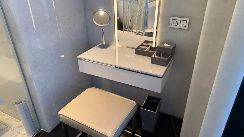 Das gilt insbesondere im Schminkbereich, der im hinteren Teil des Badezimmers zu finden ist. Am Schminktisch mit kleinem Hocker kann man sich für den Abend vorbereiten und derweil einen tollen Ausblick genießen.