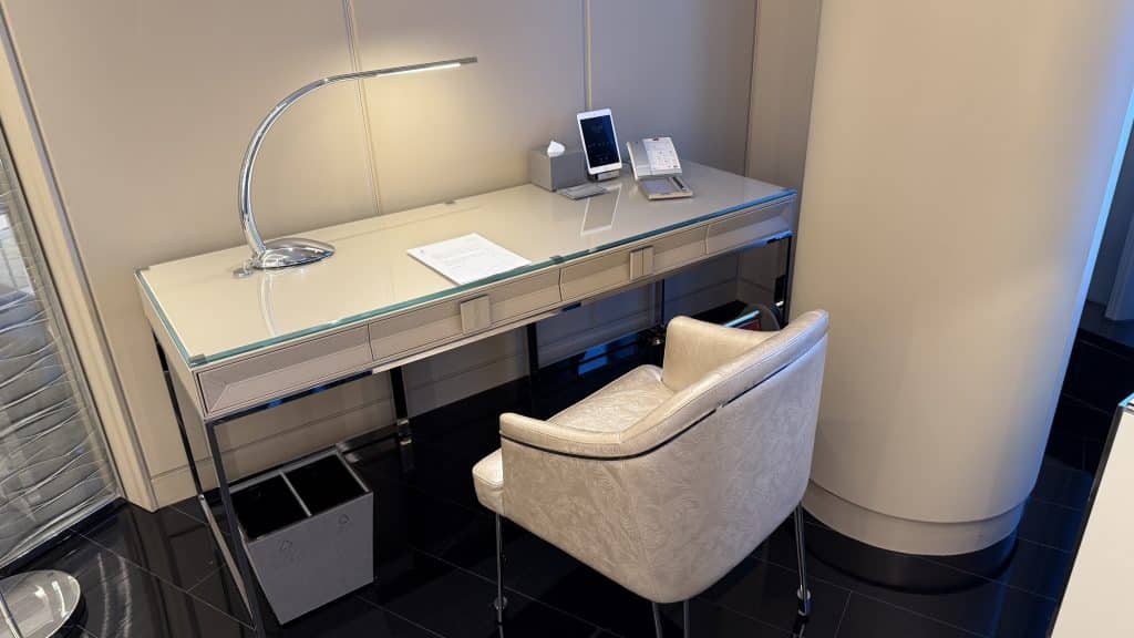 Daneben ist seitlich auch noch ein großer Schreibtisch zu finden, der nicht nur viel Platz bietet, sondern darüber hinaus auch noch mit einem bequemen Sessel daherkommt. Auf dem Schreibtisch gibt es unter anderem auch ein iPad mit Informationen über das Hotel, Briefpapier und ein paar Postkarten gibt es ebenfalls.