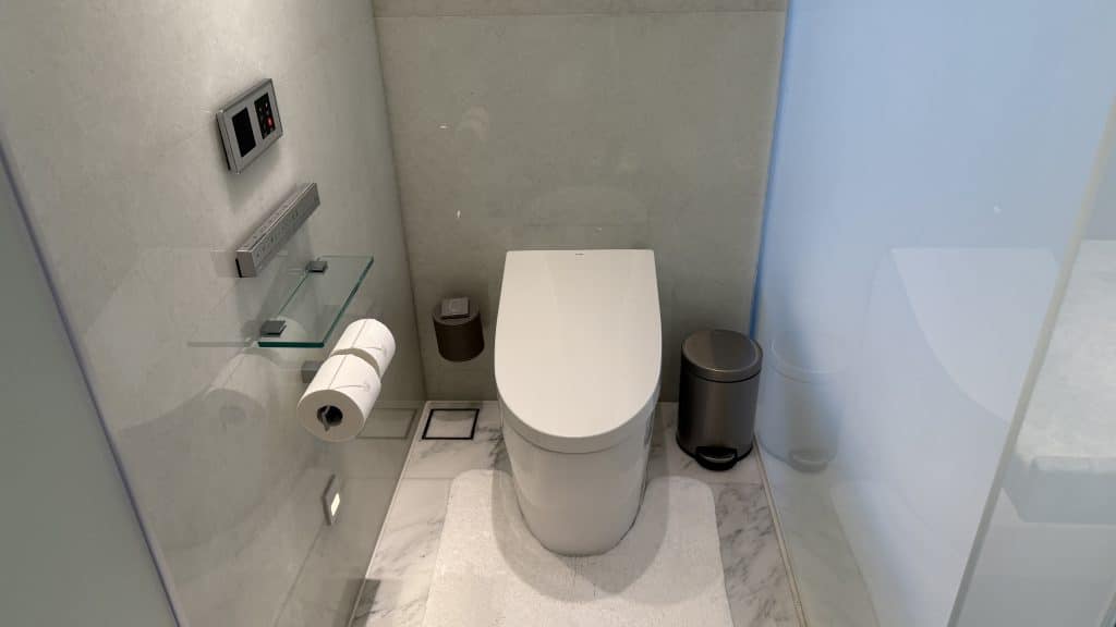 Direkt auf der linken Seite davon ist die Toilette hinter einer Milchglastür versteckt. Freuen darf man sich hier auf jede Menge Funktionen. Negativ ist mir allerdings aufgefallen, dass die Tür nicht gänzlich schließt, sodass man durch das verglaste Badezimmer nahezu gar keine Privatsphäre hat.