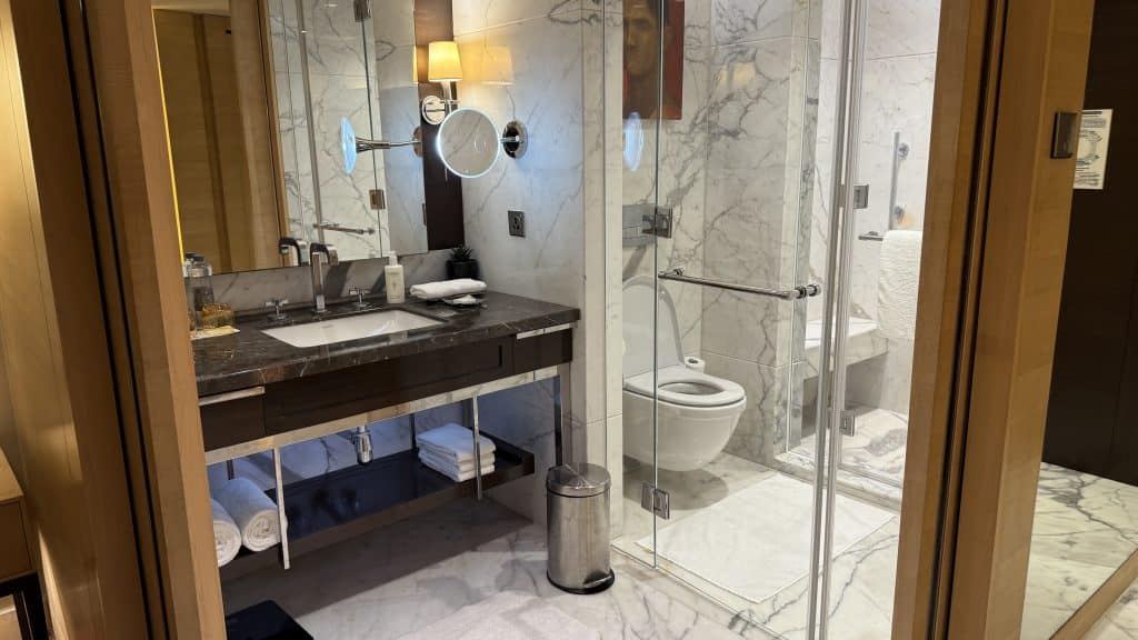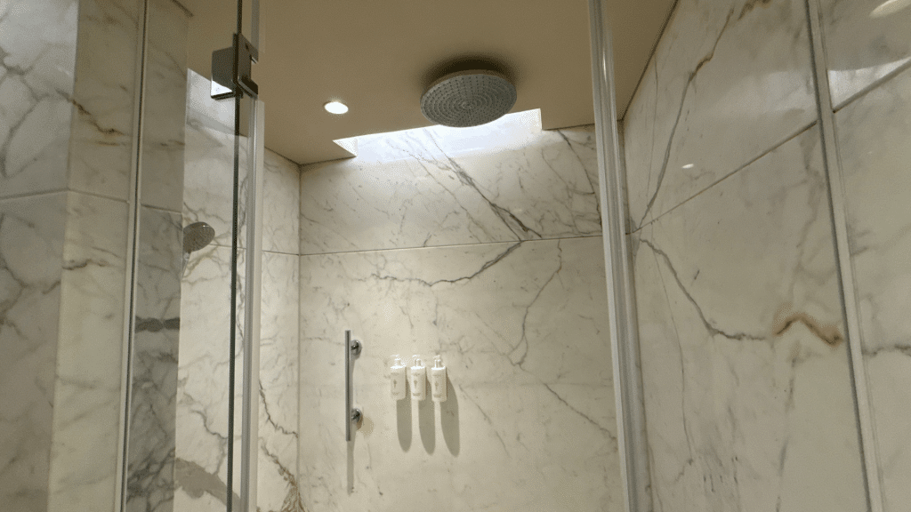 Dahinter kommt dann die Dusche – ein Set-up, das ich bei meinen zahlreichen Hotelbewertungen so auch noch nicht gesehen habe. Diese ist angenehm groß und bietet sowohl einen regulären als auch einen Regenduschkopf mit gutem Wasserdruck.