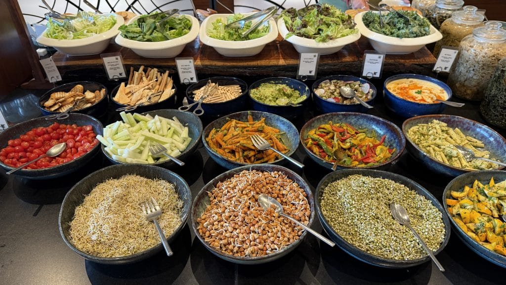Diverse verschiedene Gemüsesorten stehen als Kontrast zudem auch bereit, sodass man sich gut einen Salat machen kann. Positiv wahrgenommen habe ich ansonsten auch die verschiedenen aufgeschnittenen Obstsorten, die sehr lecker waren.