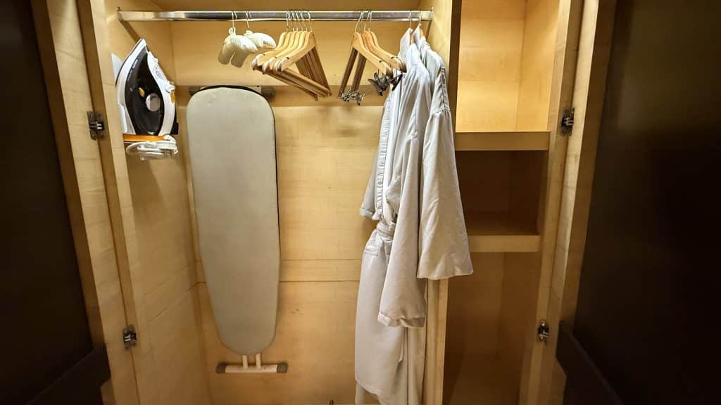Hier findet man unter anderem auch einen großen Kleiderschrank, in dem man gut seine Sachen verstauen kann und gleichzeitig auch ein Bügelbrett, ein Bügeleisen, hochwertige Bademäntel und weitere Utensilien findet.