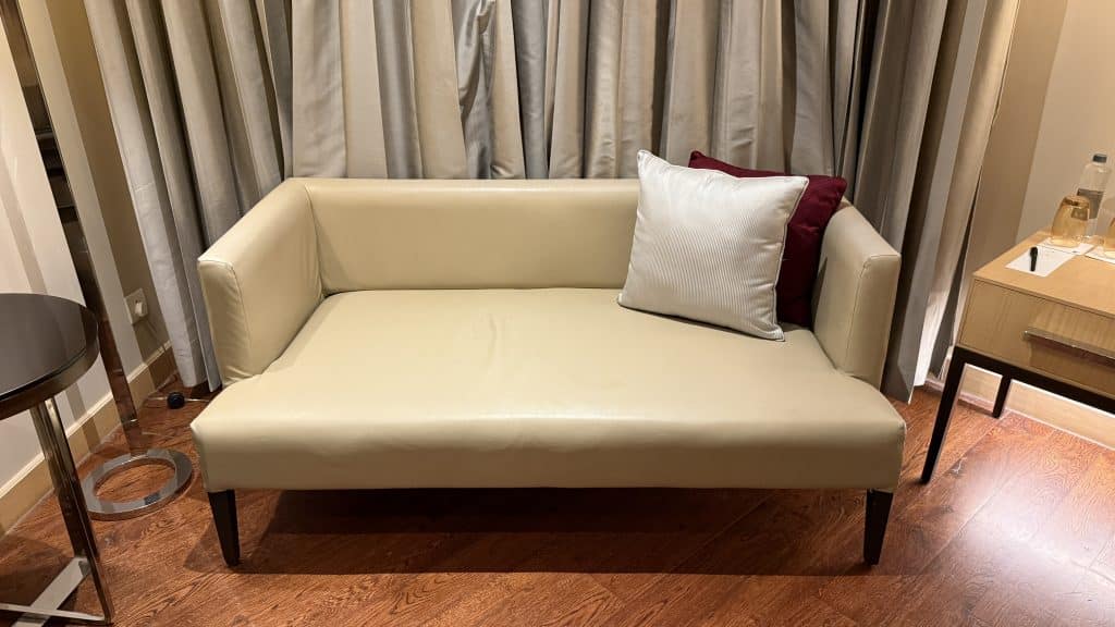 Ansonsten gibt es noch ein kleines Sofa, das ich allerdings nicht allzu stilvoll und auch nicht sonderlich bequem fand. Zudem wirkt es zwischen dem Nachttisch und dem Schreibtisch doch ziemlich gequetscht.