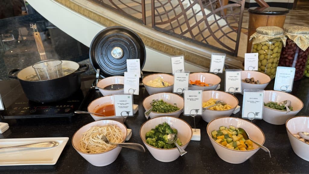 Erwähnenswert sind ansonsten noch die verschiedenen Live-Cooking-Stationen – so kann man sich etwa genauso eine Nudelsuppe wie auch einige indische Klassiker zubereiten lassen, was ich natürlich auch getestet habe.