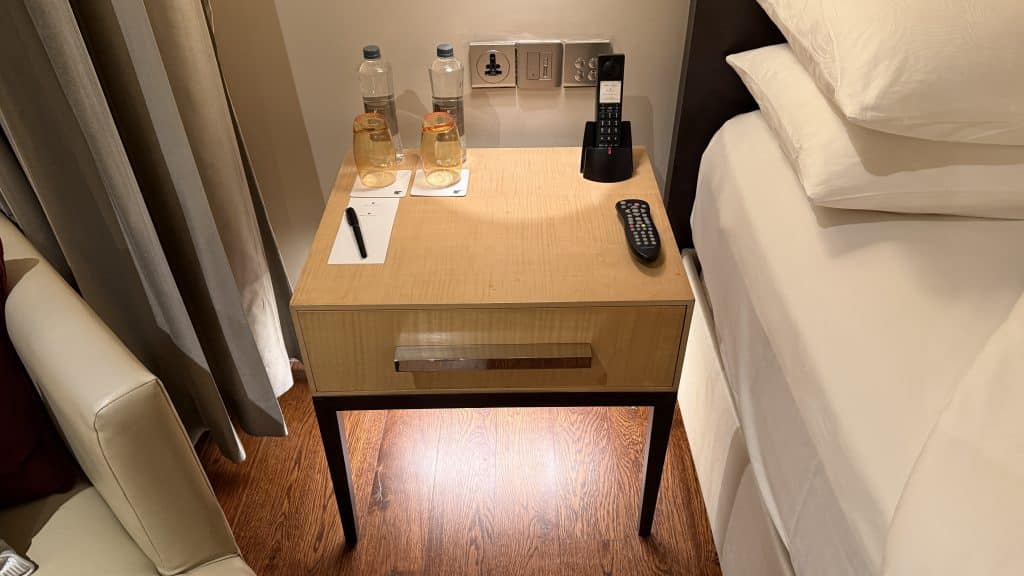 Beidseitig gibt es zudem je einen Nachttisch mit ausreichend Steckdosen sowie Lichtschaltern. Positiv hervorzuheben ist auch der Turn Down Service, durch den auch bereits Wasser neben dem Bett stand.
