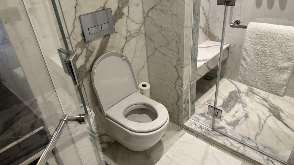 Der hochwertige Marmor, den man im gesamten Badezimmer findet, will ich an dieser Stelle auch noch einmal positiv hervorheben. Dieses wird auch im Bereich der Toilette verwendet, die als nächster Bereich zwischen zwei Glastüren folgt.