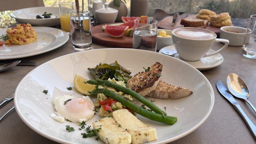 Nach der Rückkehr von der morgendlichen Safari steht das Frühstück im Restaurant bereit. Eine vorbereitete Frühstücksplatte mit Obst, Käse und Aufschnitt sowie Brot wird grundsätzlich zu den á la carte Speisen gereicht. Zudem gibt es frische Säfte oder Smoothies. Die Qualität der Speisen war gut, insgesamt die Breite der Auswahl abgesehen der wirklich guten á la carte Elemente vergleichbar zu anderen Luxushotels eher eingeschränkt.