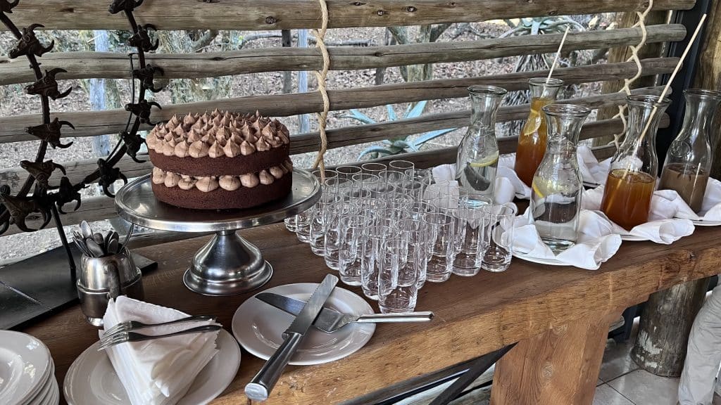 Während der abendlichen Fahrten wird bei Anbruch der Dunkelheit auf einer Freifläche mitten in der Natur eine kleine “Bush-Bar” mit alkoholischen Getränken und Softdrinks sowie Snacks aufgebaut. Dies war ein besonderes Erlebnis. Nach dem Sonnenuntergang und ohne die Lichtverschmutzung kann man von hier aus auch wunderbar die Sterne beobachten. Am Morgen wird nach Sonnenaufgang ebenfalls während der dreistündigen Safari ein Stop eingelegt, wo Kaffee und Tee gereicht werden.