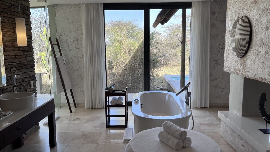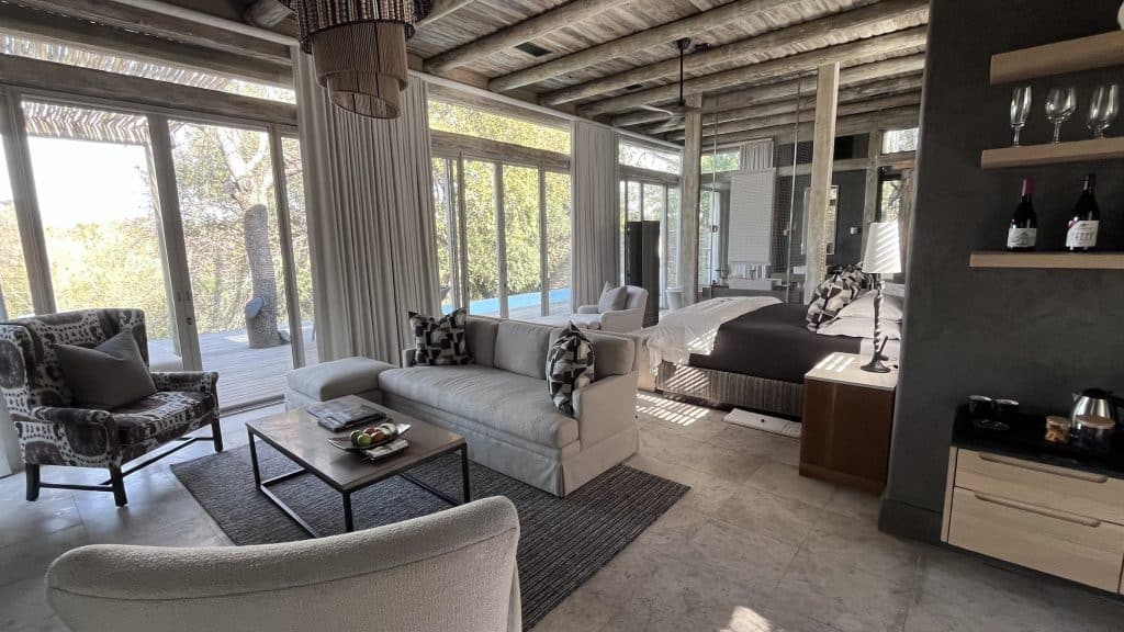 Die Einrichtung ist modern und stilvoll, mit dezenten afrikanischen Akzenten. Besonders gut hat mir die offene, sehr große Fensterfront gefallen. Von jedem Winkel der Villa konnte man schauen, was draußen in der Natur passiert.
