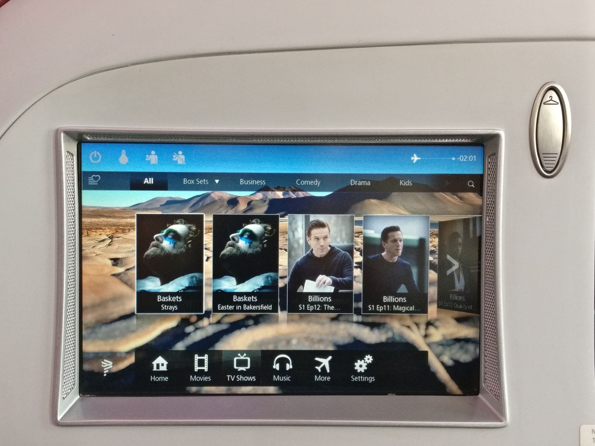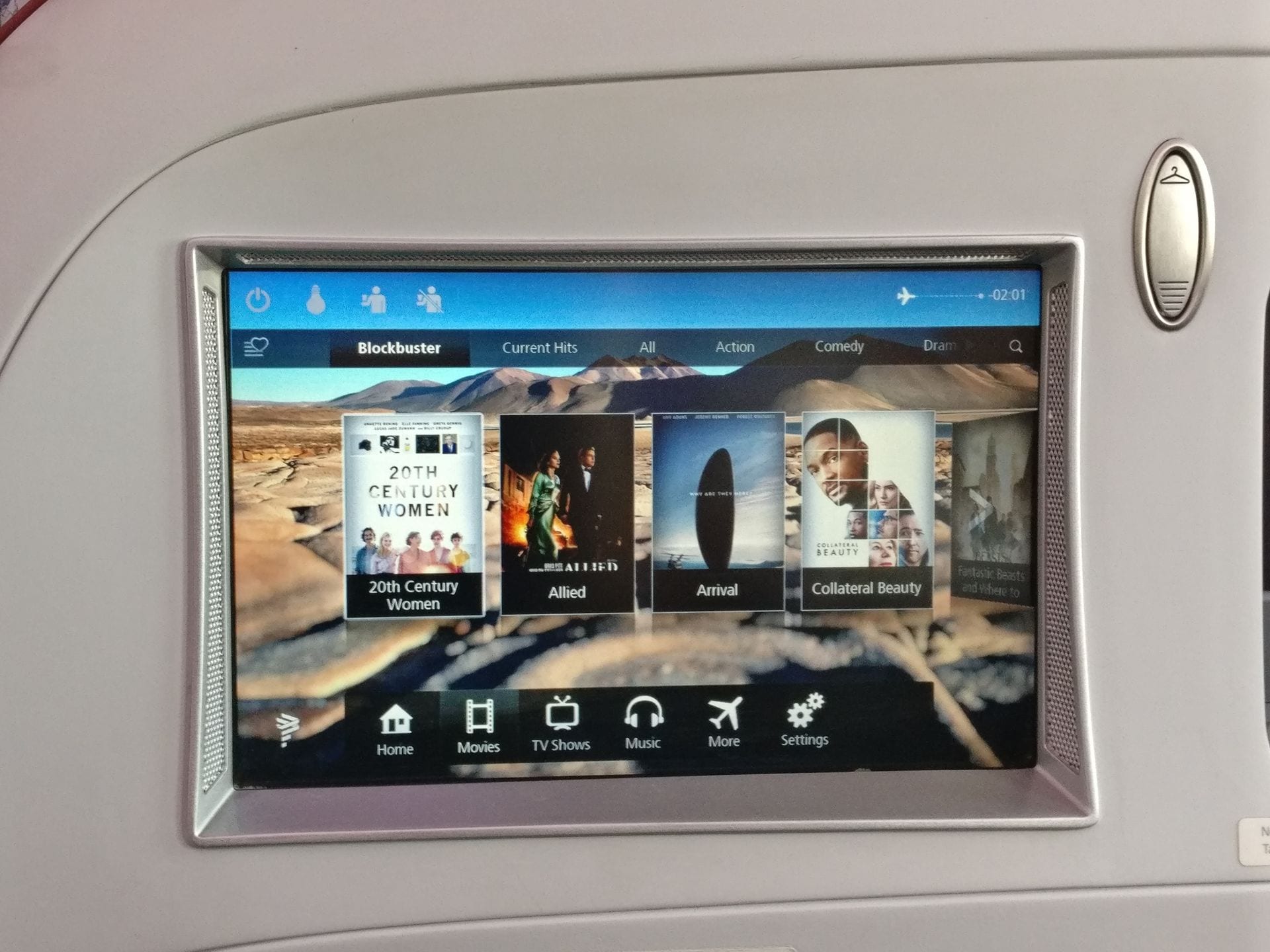 Dieses bietet eine solide Auswahl an Filmen, Serien und Musik an, wobei es viele Optionen auch in Englisch gibt, sodass jeder zumindest den einen oder anderen passenden Film finden sollte. Die Auswahl ist allerdings doch relevant schwächer als ich es etwa bei meinem Emirates First Class Review erlebt habe.