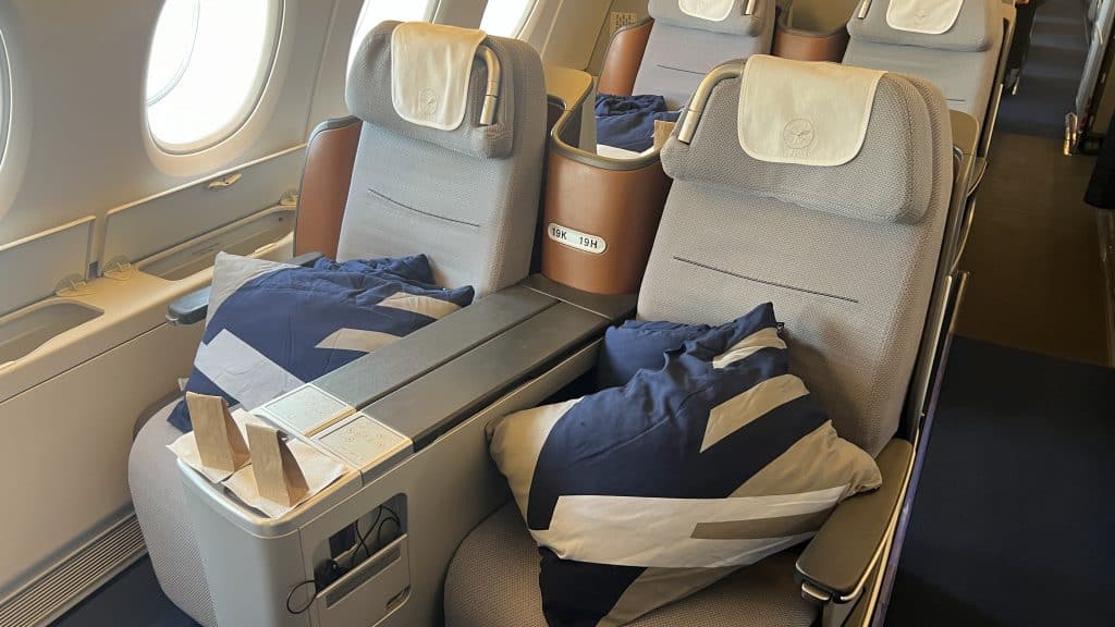 Der Airbus A380 dürfte dabei auch nicht die neue Lufthansa Allegris Bestuhlung bekommen, die ich bei einem kurzen Test nach der Einführung als deutlich angenehmer wahrgenommen habe. Grundlegend sind die Sitze in der „alten“ Lufthansa Business Class insbesondere sehr wenig privat. Dadurch sitzt man ziemlich nah an den Mitreisenden. Bei einer Reise mit einem Partner ist das weniger schlimm, neben einer fremden Person stört mich persönlich die fehlende Privatsphäre doch stärker. So gibt es etwa keine echte Abtrennung zwischen den beiden Sitzplätzen in einem „Paar“.