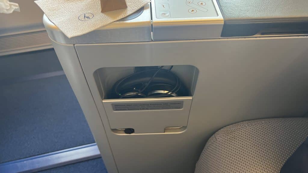 Beim Boarding liegen an jedem Sitz zudem bereits ein Kissen, eine Decke und auch eine Matratzenauflage bereit. Hier merkt man dann auch schon ein kleines Problem des Sitzes, denn die Ablagefläche ist doch ziemlich begrenzt. Außer ein wenig Platz unter der Ottomane, einem Zeitschriftenfach sowie einer kleinen Ablage für die Kopfhörer und dem offenen Bereich neben dem Sitz (hier muss man allerdings höllisch aufpassen, dass beim Verstellen nichts unter den Sitz fällt) fehlt es komplett an Möglichkeiten, um z.B. einen Laptop zu verstauen.