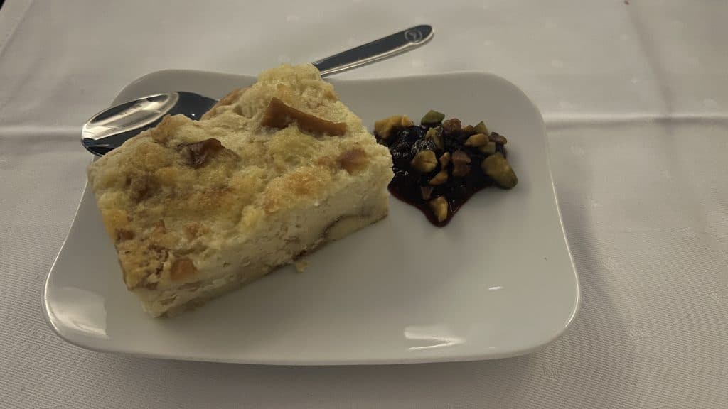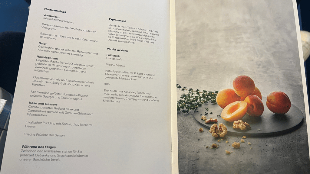 Schon beim Boarding wird auch das Menü serviert, das auf den Flügen von den USA nach Europa in der Regel aus einem Abendessen mit mehreren Gängen (sofern gewünscht) sowie einem kleinen Frühstück besteht. Entsprechend konnte ich auch auf diesem Flug zwei Mahlzeiten testen. Das Menü hat dabei bei mir einen guten Eindruck hinterlassen. Zur Wahl stehen drei verschiedene Vorspeisen, ein automatisch dazu servierter Salat, drei Hauptspeisen sowie eine Auswahl aus Käse und zwei weiteren Desserts. Alternativ kann man auch ein Expressmenü wählen. Beim Frühstück stehen ebenfalls zwei Optionen zur Wahl.