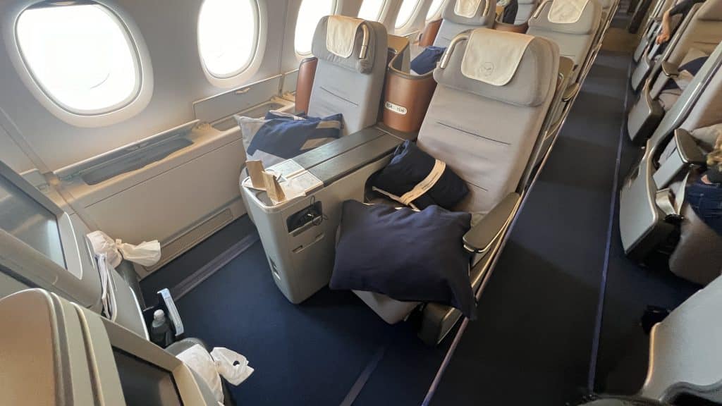 Mit Blick auf den Fußraum muss man sich in der Lufthansa Business Class, wie meist in dieser Reiseklasse, keine Sorgen machen und auch Fenster gibt es an jedem Platz ausreichend. Dennoch ist das Produkt im Vergleich zur Konkurrenz doch ziemlich aus der Zeit gefallen. Wenn ich etwa auf mein British Airways Club Suite Review oder meine Air France Business Class Boeing 777 Bewertung blicke, schneidet die Lufthansa mit ihren alten Sitzen alles andere als gut ab.