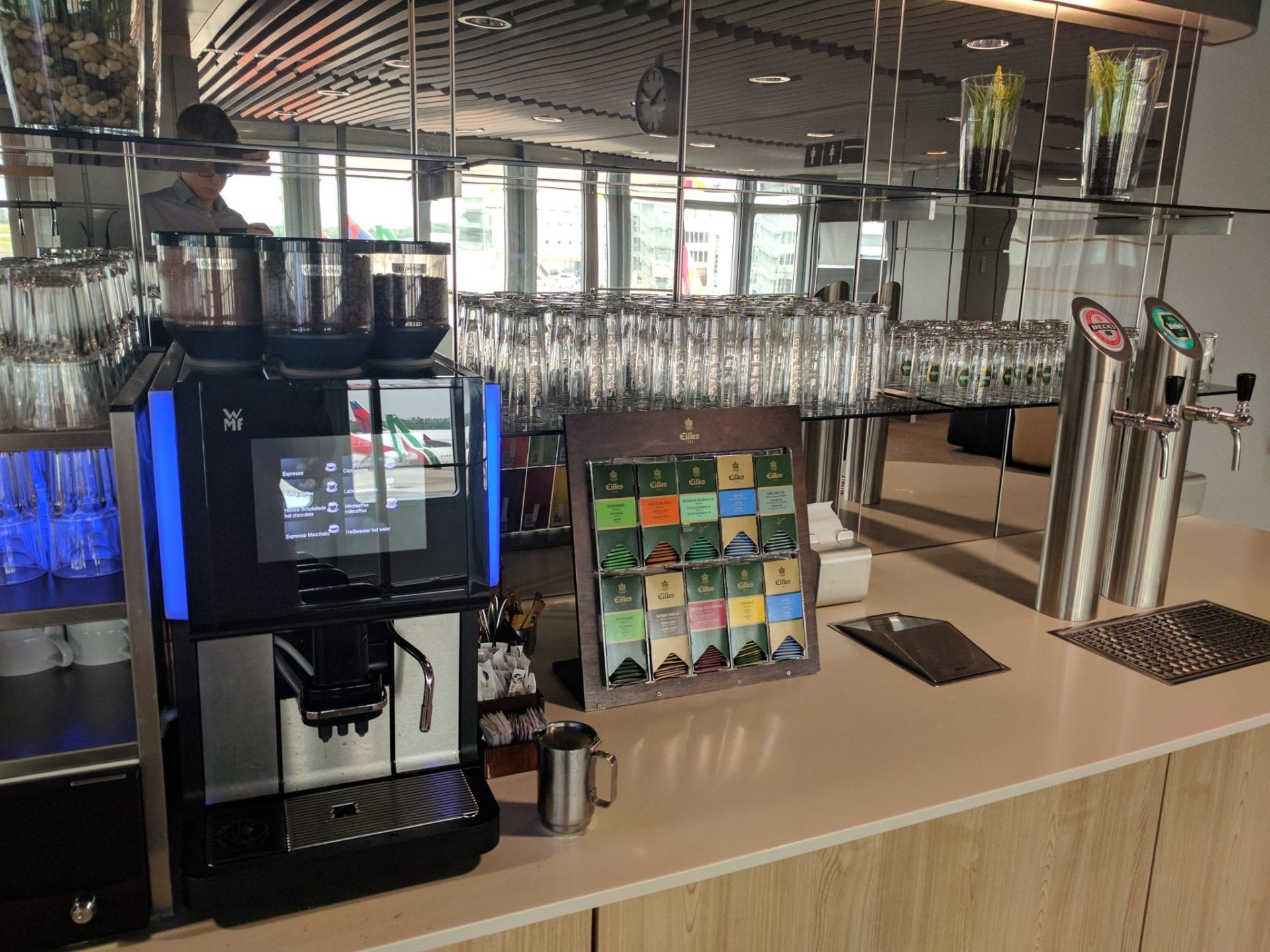 Zu Trinken gibt es in der Lufthansa Business Lounge Düsseldorf neben Softdrinks auch diverse Heißgetränke in mittelmäßiger Qualität. Am Morgen wenig relevant, gibt es in der Lounge auch Spirituosen, Bier vom Fass und einige Weine.