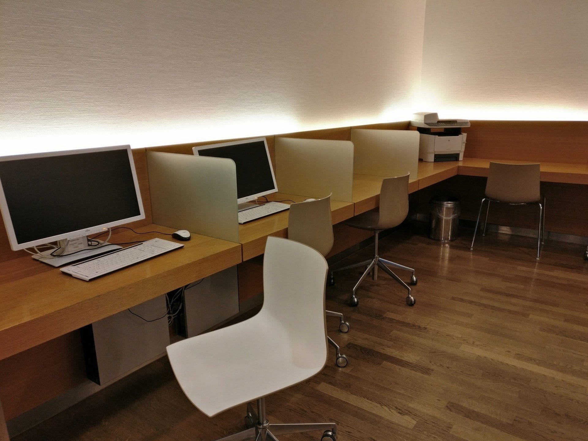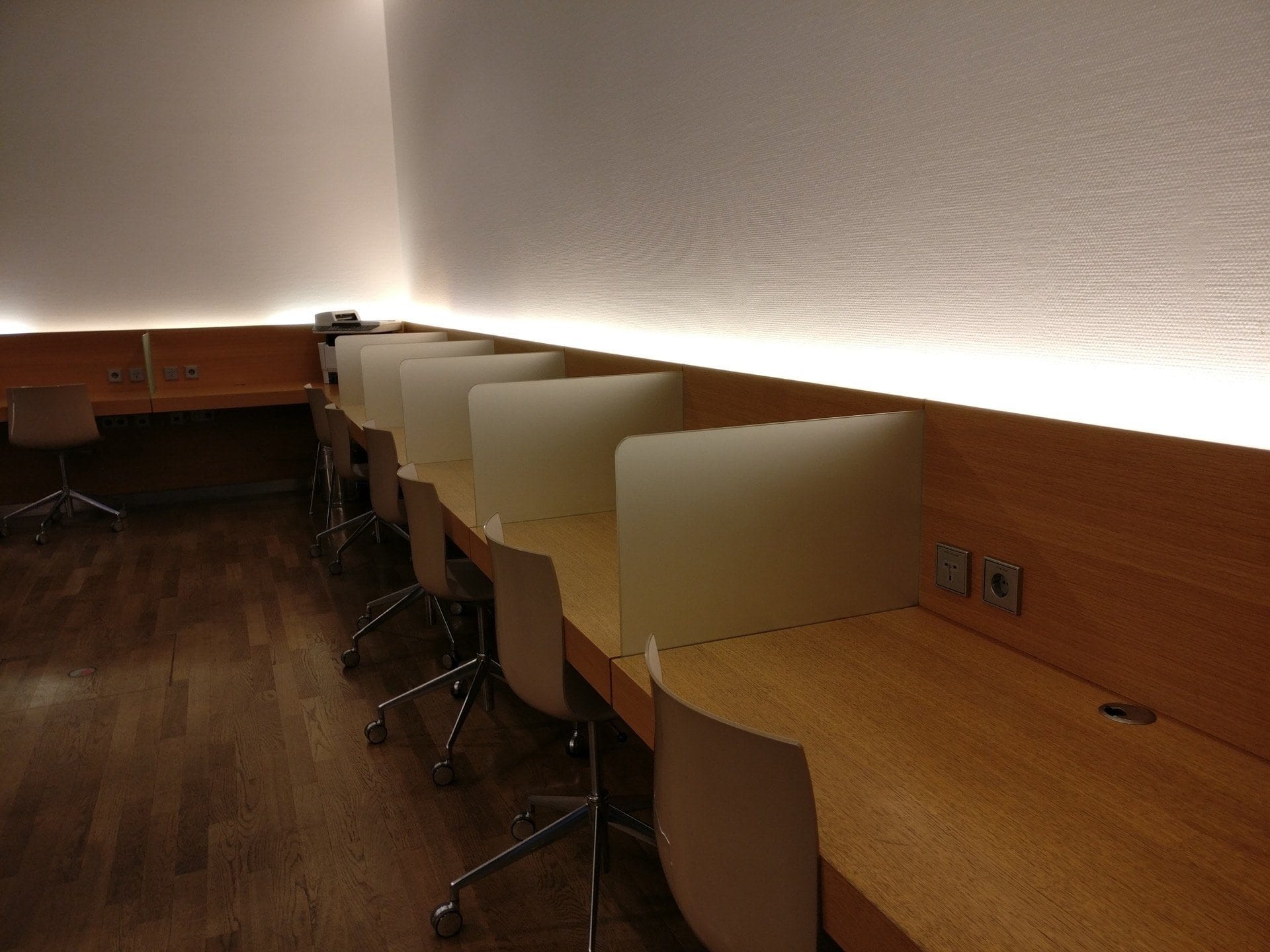 Selbstverständlich ist schnelles WLAN in der Lounge vorhanden, das auch bei vielen Gästen noch tadellos funktioniert. Zum besseren Arbeiten gibt es einen Arbeitsbereich mit Steckdosen und von Lufthansa gestellten PCs.