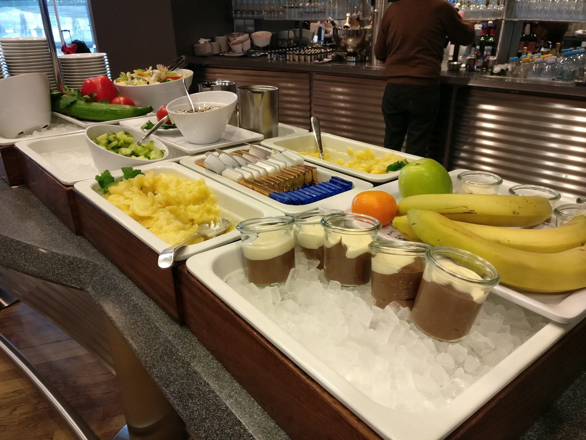 Neben Softdrinks und Kaffee werden den Tag über verschiedene kalte Gerichte angeboten. Im Unterschied zu vielen Business Lounges an anderen Flughäfen gibt es zusätzlich ein warmes Gericht, das sich je nach Tageszeit ändert.