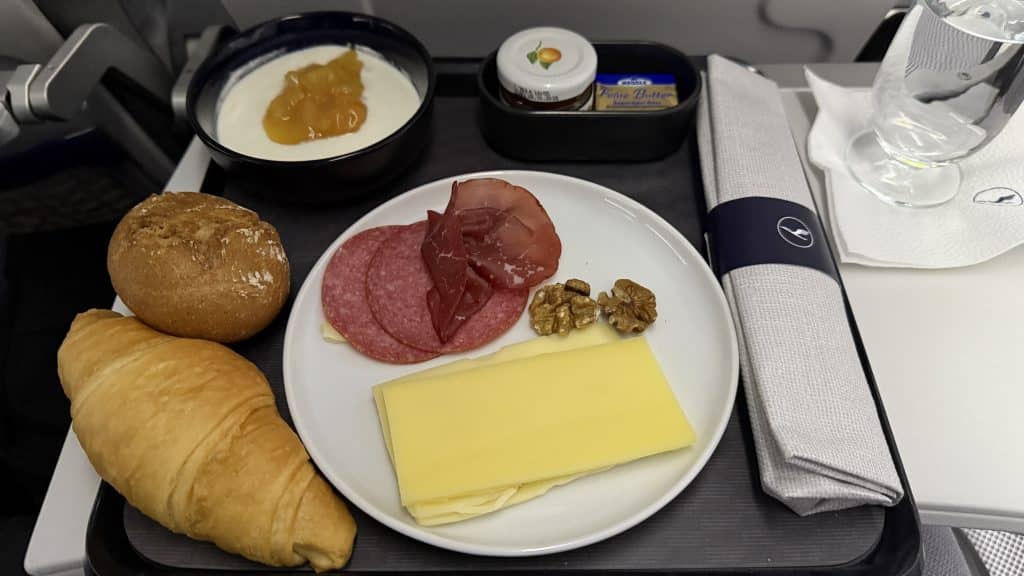 Etwas unkreativ empfand ich auf meinem Flug von Posen nach München derweil das servierte Frühstück, das im Grunde nur aus ein wenig Käse und Aufschnitt sowie einem Croissant und einem Brötchen bestand. Ganz lecker war aber auch hier das zusätzlich servierte Joghurt.