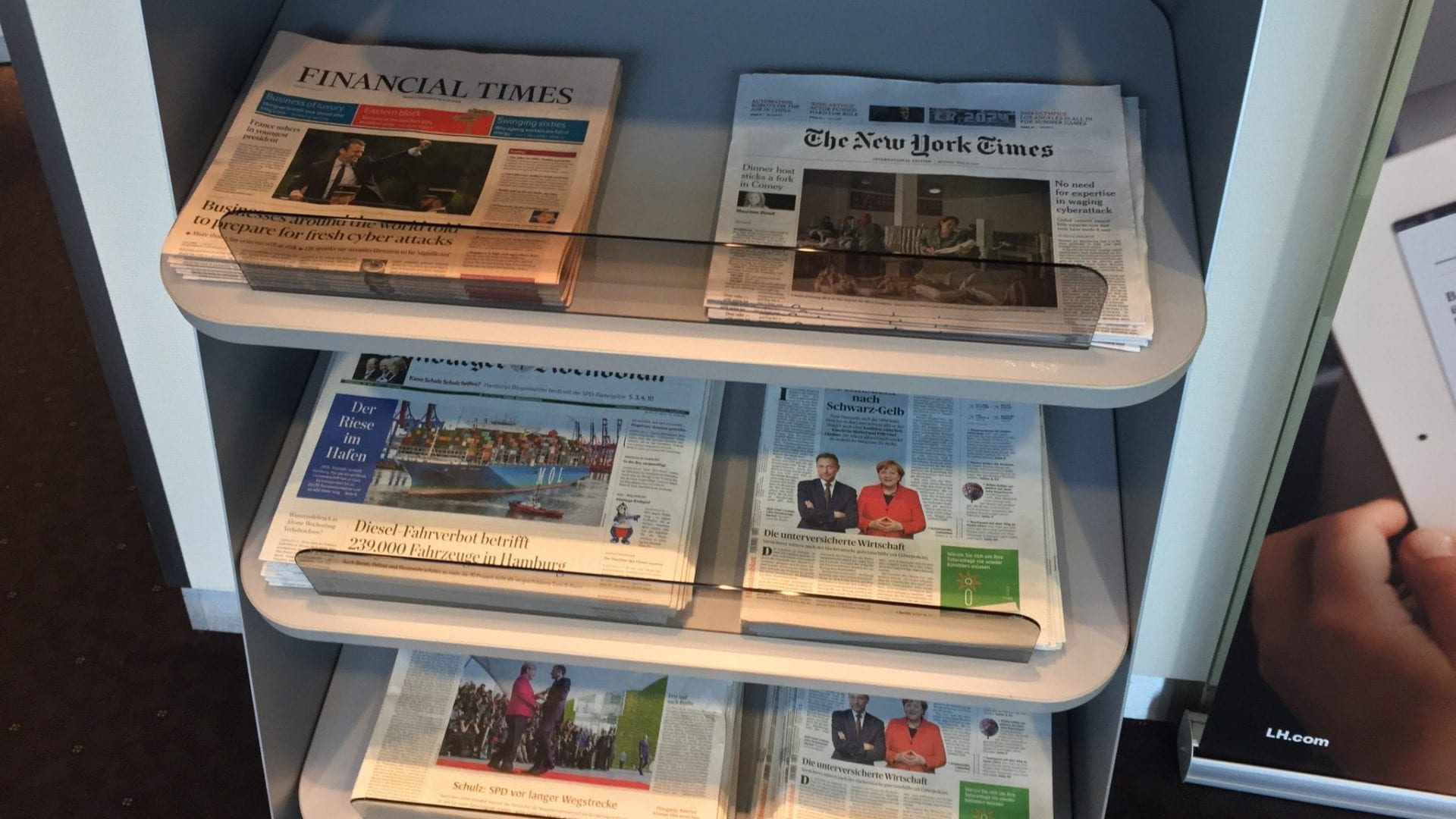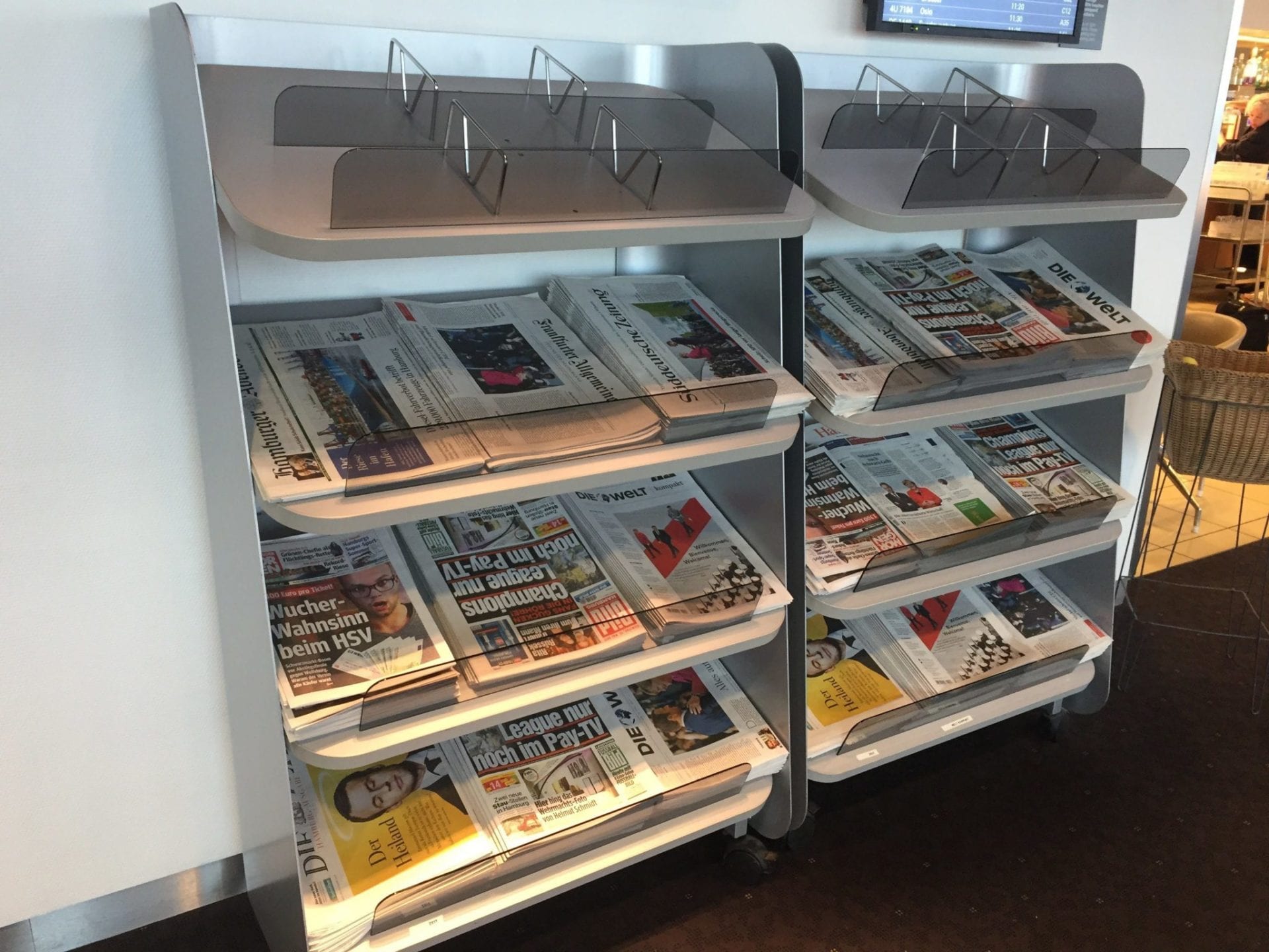 Zuletzt kommen wir in meiner Lufthansa Senator Lounge Hamburg Bewertung noch zu dem, was die Lounge an Annehmlichkeiten und in puncto Entertainment zu bieten hat. Sobald man die Lounge betritt, befindet sich zur linken ein Ständer mit verschiedenen Zeitungen und Zeitschriften. Es ist also kein Problem, die Zeit vor dem Flug mit Lesen zu verbringen und sich so zu beschäftigen.