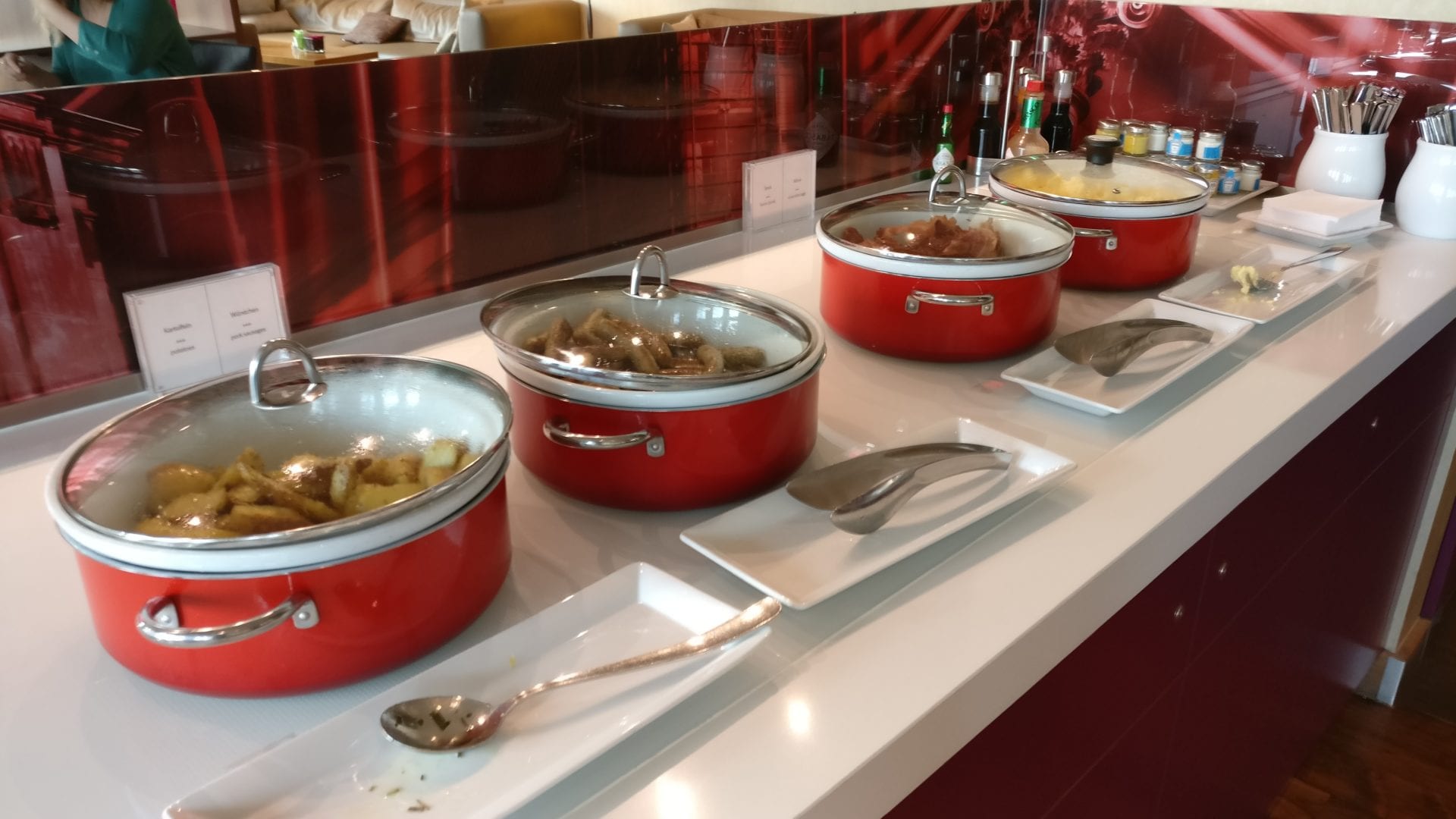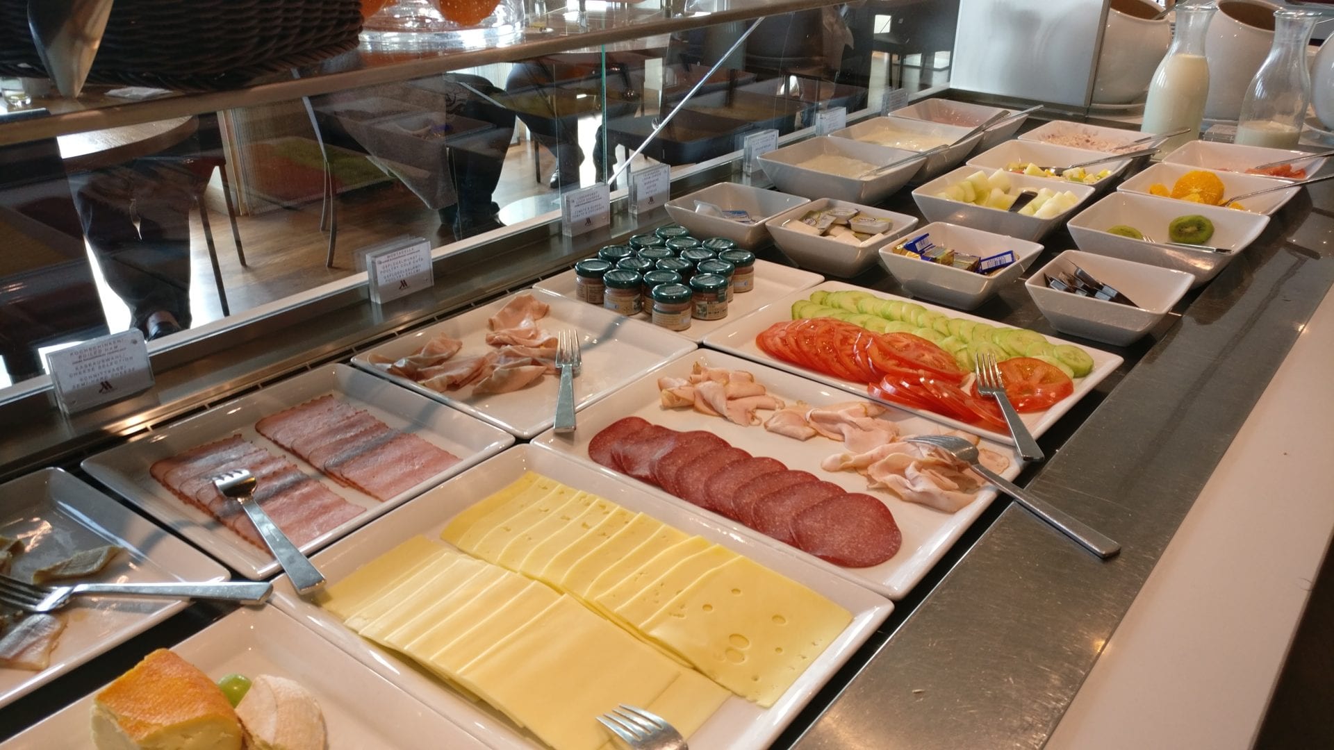 Dazu gibt es eine gute Auswahl an Getränken und eine Kaffeemaschine, die den ganzen Tag über bereit steht. In Sachen Verpflegung verändert sich das Angebot über den Tag. Morgens wird das Frühstück serviert, das mit mehreren warmen Optionen und einem auch ansonsten sehr ordentlichen Buffet überzeugt. Frische Eierspeisen können auch bestellt werden, kommen dann aber aus der Hauptküche des Restaurants im Erdgeschoss, sodass die Mitarbeiter kein sonderlich großer Freund von solchen Bestellungen sind.