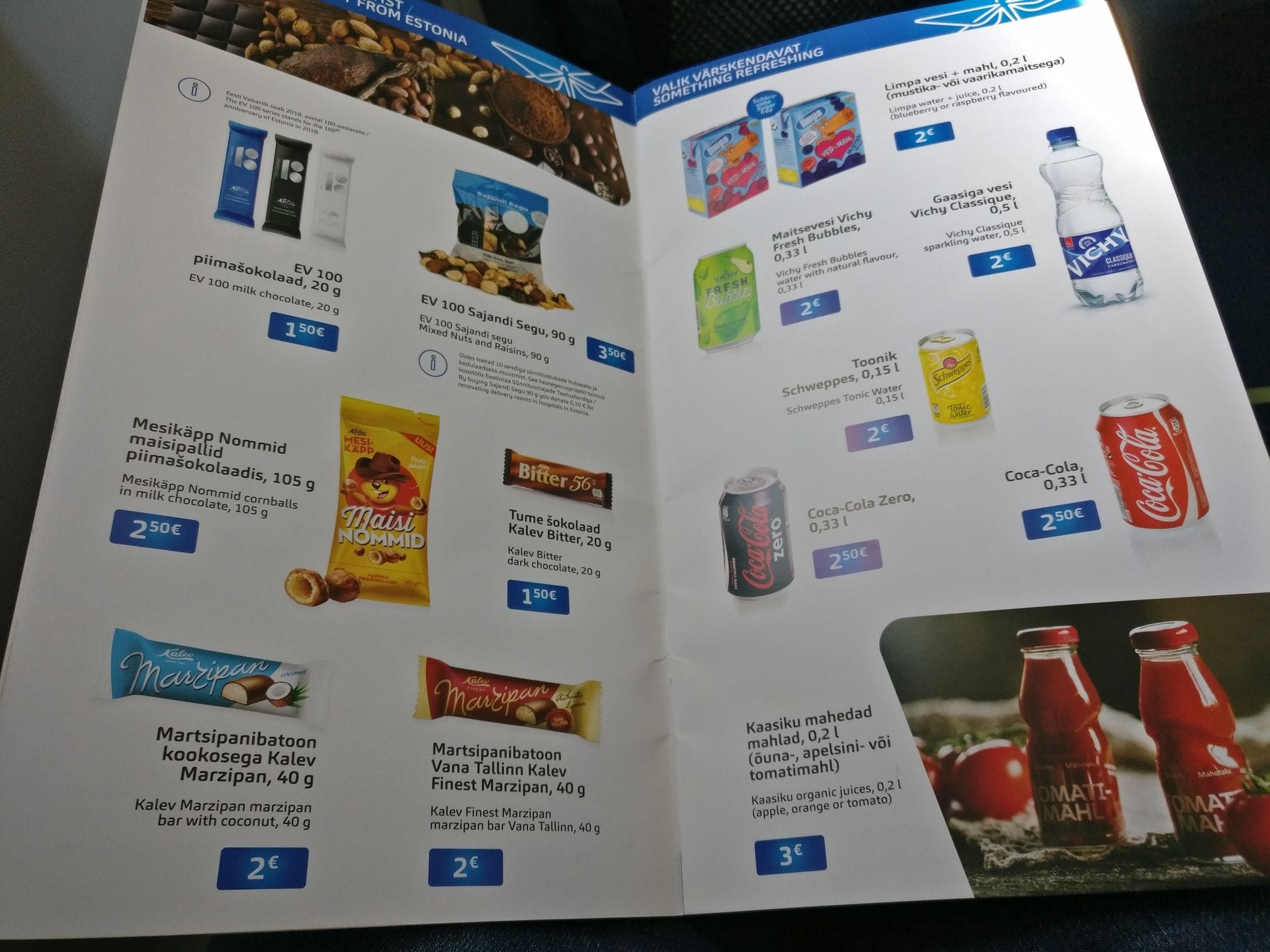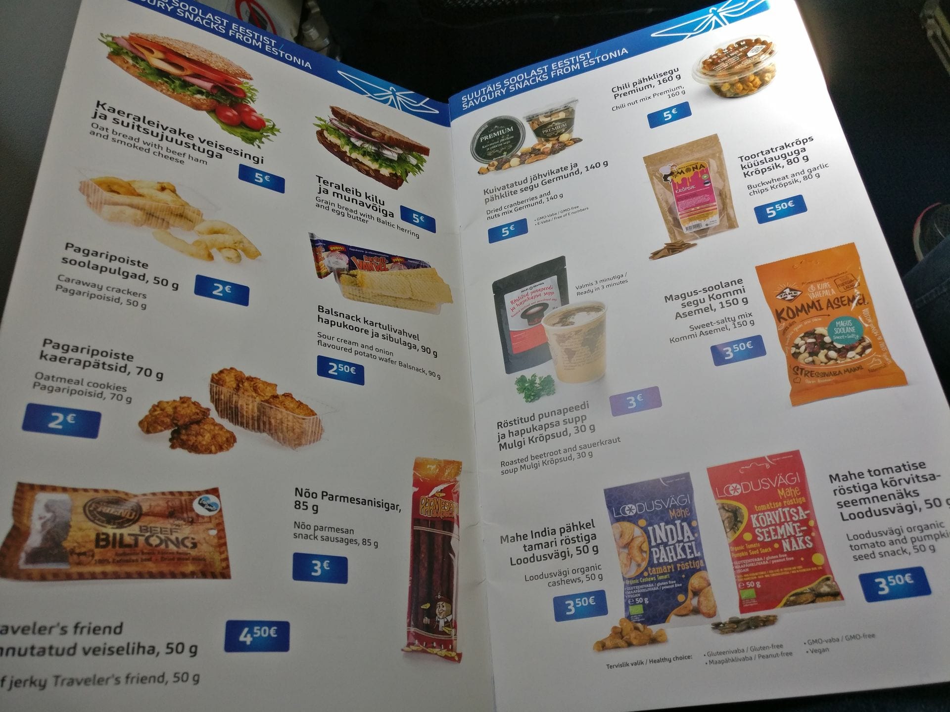 Darüber hinaus gibt es ein kleines Menü mit verschiedenen Snacks und Getränken. Die Auswahl ist natürlich etwas begrenzt, da es sich um einen Regionaljet handelt.
