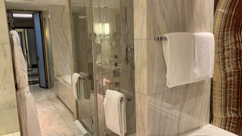 Der opulente Stil mit Wänden aus Marmor und den edlen Akzenten passt auf jeden Fall zum Ambiente und dem Anspruch des Hotels. Ein besonderes Highlight ist der kleine Fernseher, der im Hauptspiegel in der Nähe des Waschbeckens integriert ist.