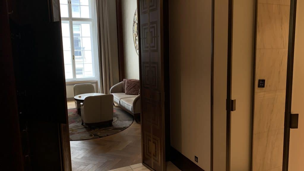 Ursprünglich hatte ich im Andaz Wien ein Standardzimmer gebucht. Wie bereits erwähnt, konnte ich mich über eine Umbuchung in das Park Hyatt Wien und darüber hinaus über ein ziemlich großzügiges Upgrade freuen. Dieses erfolgte auf eine Park Suite auf der zweiten Etage des Hotels, die Bel Etage genannt wird, wie es für historische Häuser üblich ist. Die Geschichte des Gebäudes ist ohnehin an vielen Stellen im Hotel gegenwärtig, da es sich um ein ehemaliges Bank-Gebäude mit entsprechenden Merkmalen handelt.