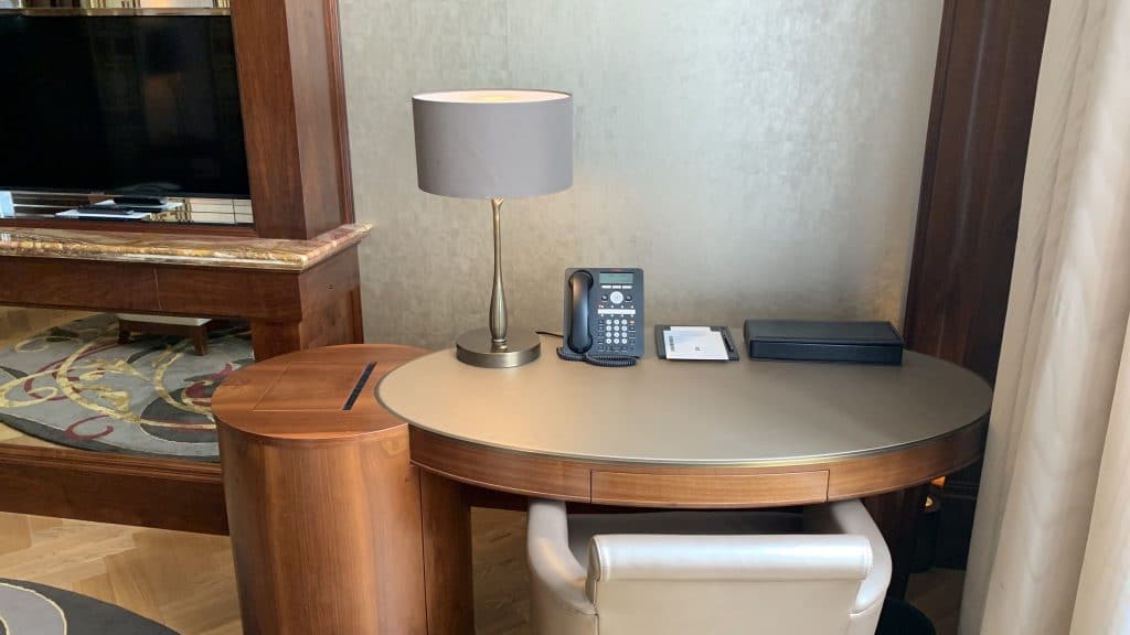 Zunächst kommt man vom Eingangsbereich in das Wohnzimmer der Suite, welches mit einem Sofa inklusive Fernsehschrank und einem Schreibtisch ausgestattet ist. Die Wand verzierte das ein oder andere edle Dekostück. Die Einrichtung gefiel mir gut und glich dem typischen Park Hyatt Stil, der moderne Elemente mit dem historischen Kern des Gebäudes verbindet.