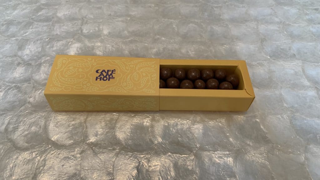 Im Wohnzimmer findet sich außerdem die Minibar mit schwingenden Türen. Auf dem Beistelltisch im Wohnzimmer lag eine Packung Schokolade, die aller Wahrscheinlichkeit nach das Willkommensgeschenk darstellte.