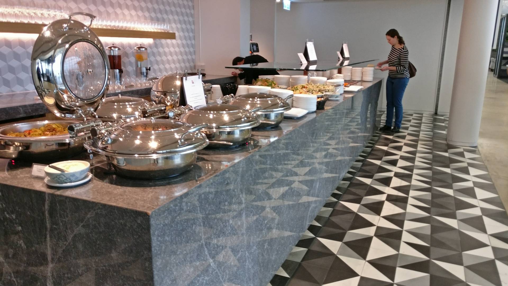 In der Mitte der Qantas Lounge Hongkong ist der Bereich zum Essen mit einer weiteren Bar, dem Buffet und Tischen. Die Essenauswahl ist für eine Business Class Lounge wirklich gut und die Qualität des Essens in üblicher, sehr guter Qualität.