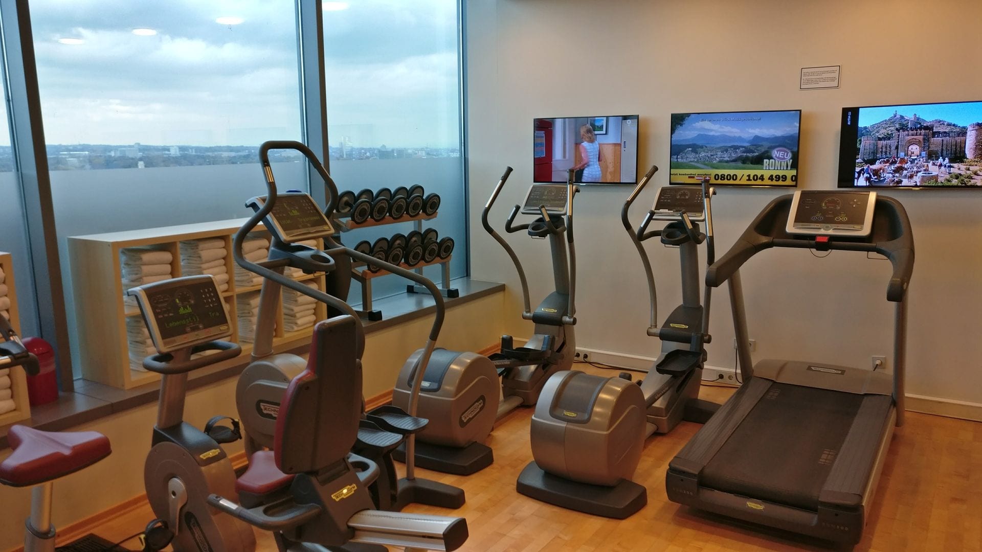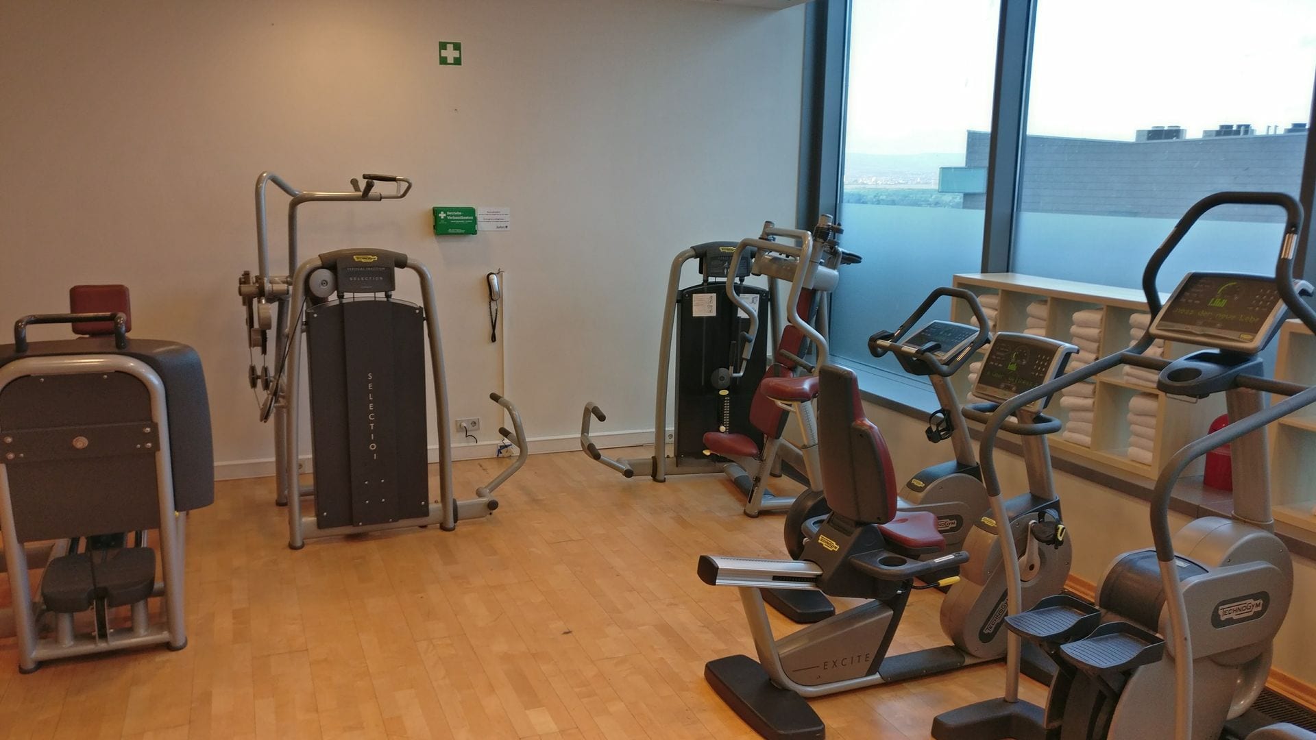 Im obersten Stockwerk des Hotels befindet sich der Erholungsbereich des Radisson Blu Frankfurt. Am Tresen werden Handtücher angeboten, direkt daneben befindet sich ein relativ kleines Fitnessstudio.