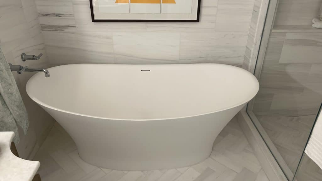 Am hinteren Ende des Badezimmers befindet sich eine freistehende Badewanne unter einem Bild, was dem Hotel ein gewisses Resort-Feeling gibt.