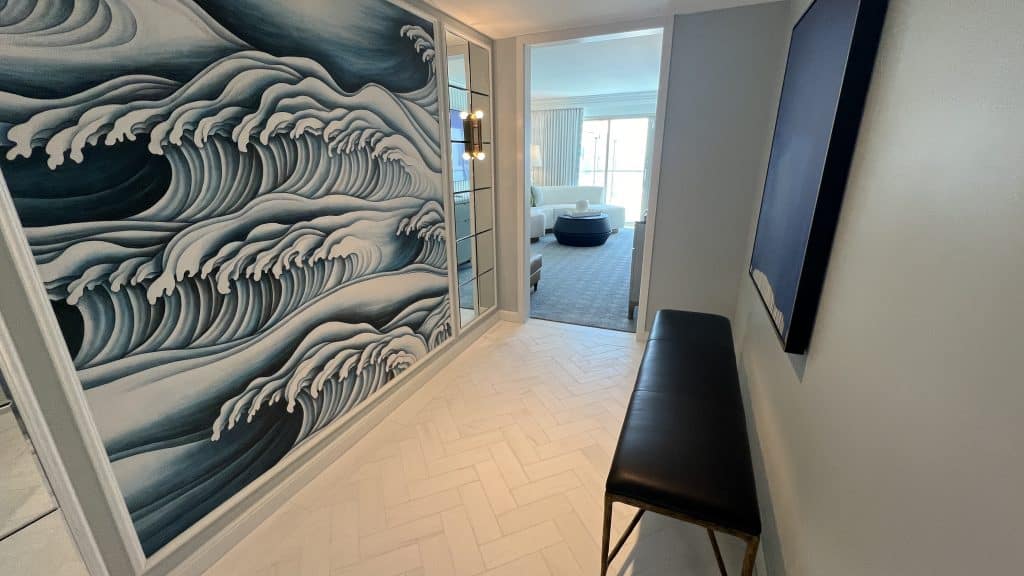Toll fand ich, dass neben einer Sitzbank im Eingangsbereich auch noch eine große Strandgrafik zu finden ist, die dem Raum direkt eine passende Atmosphäre gibt.